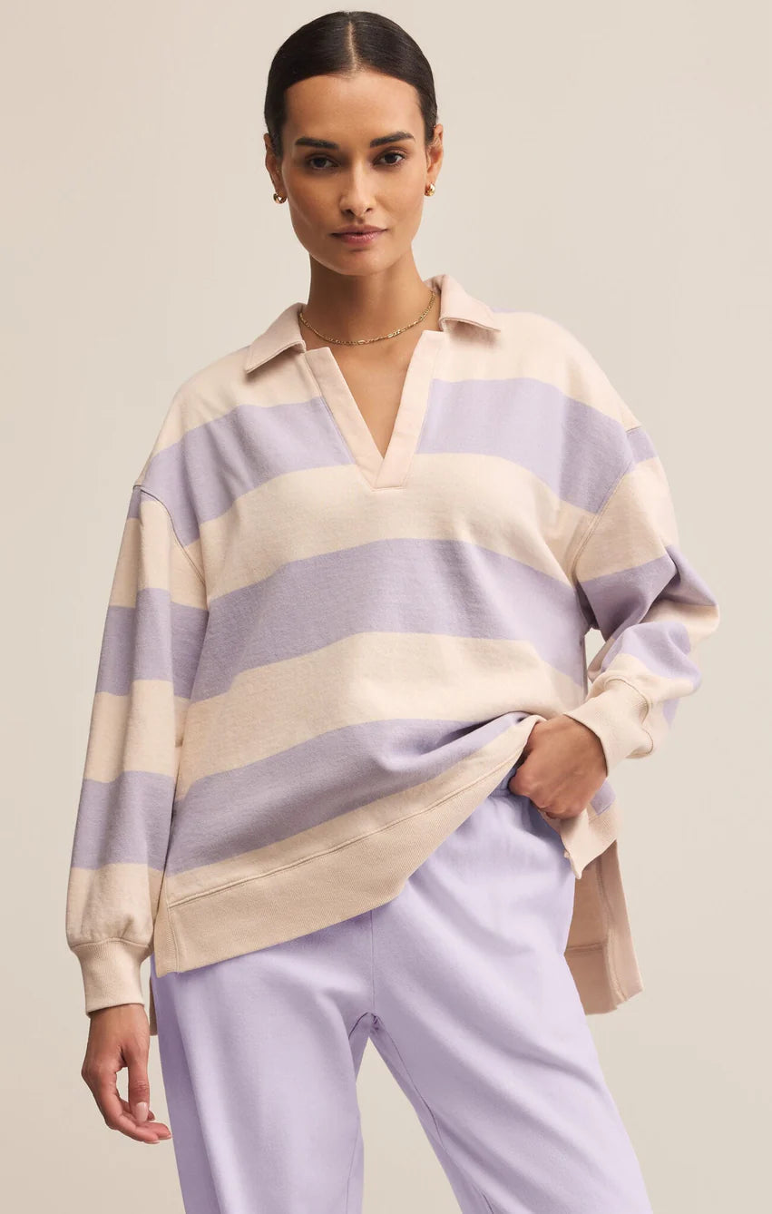 Designed in brushed fleece for a lived-in feel, this relaxed collared pullover features a hi-low hem and drop shoulders for a comfy, casual silhouette. Lightweight enough for layering, it's one you'll reach for all year.