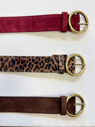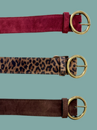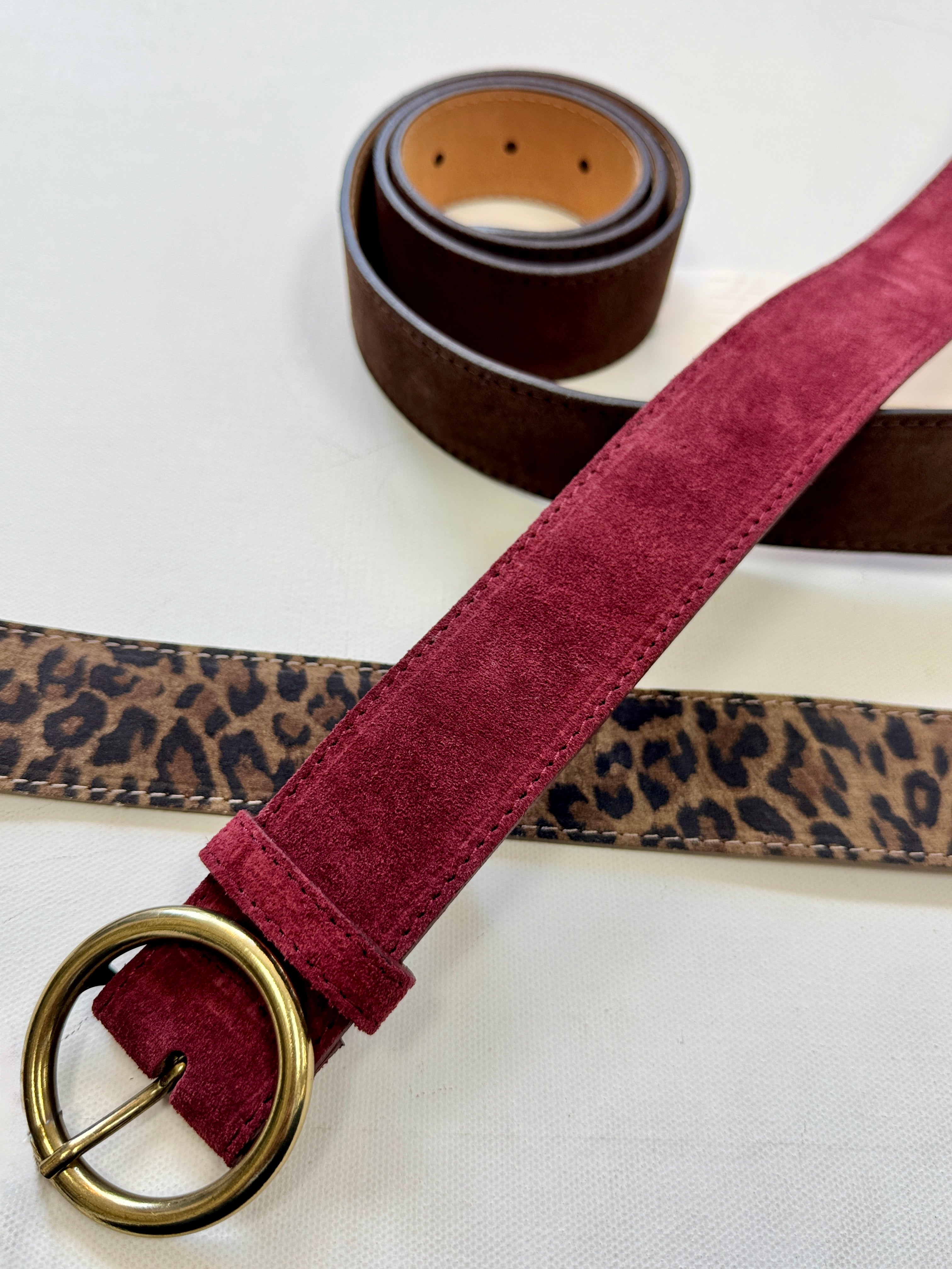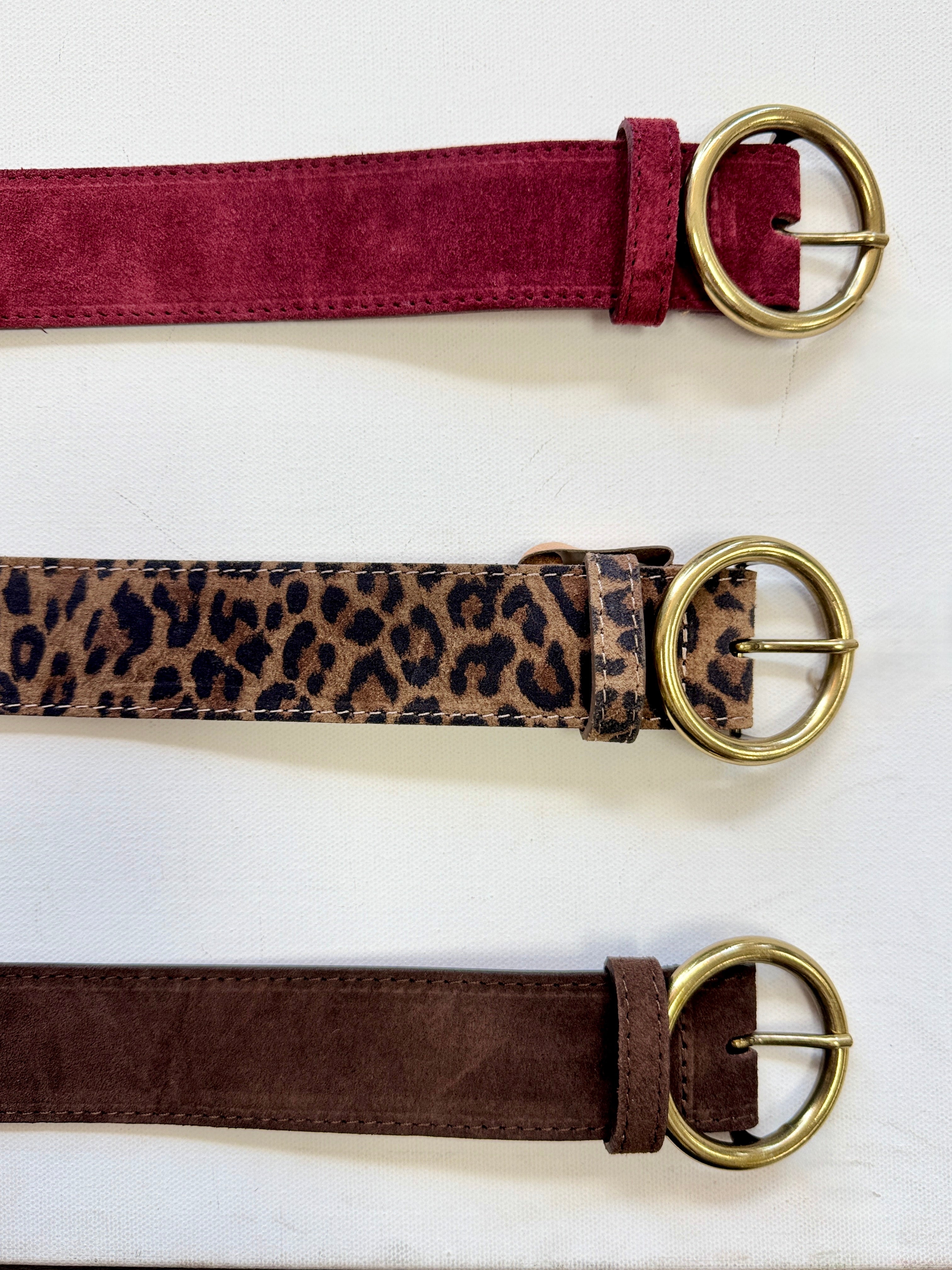 • Suede leather belt: comes in Leopard, Bordeaux, and Chocolate