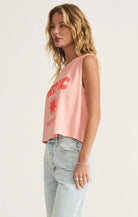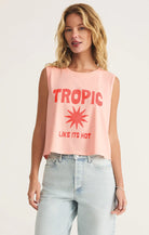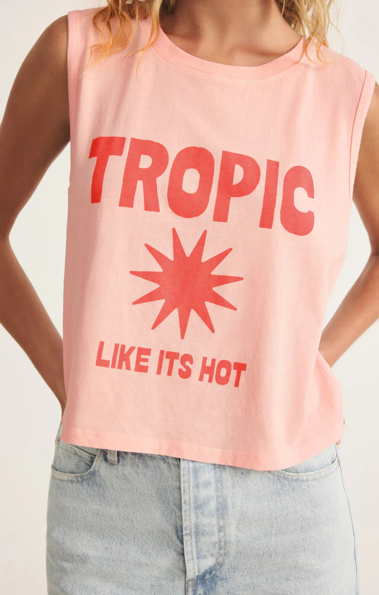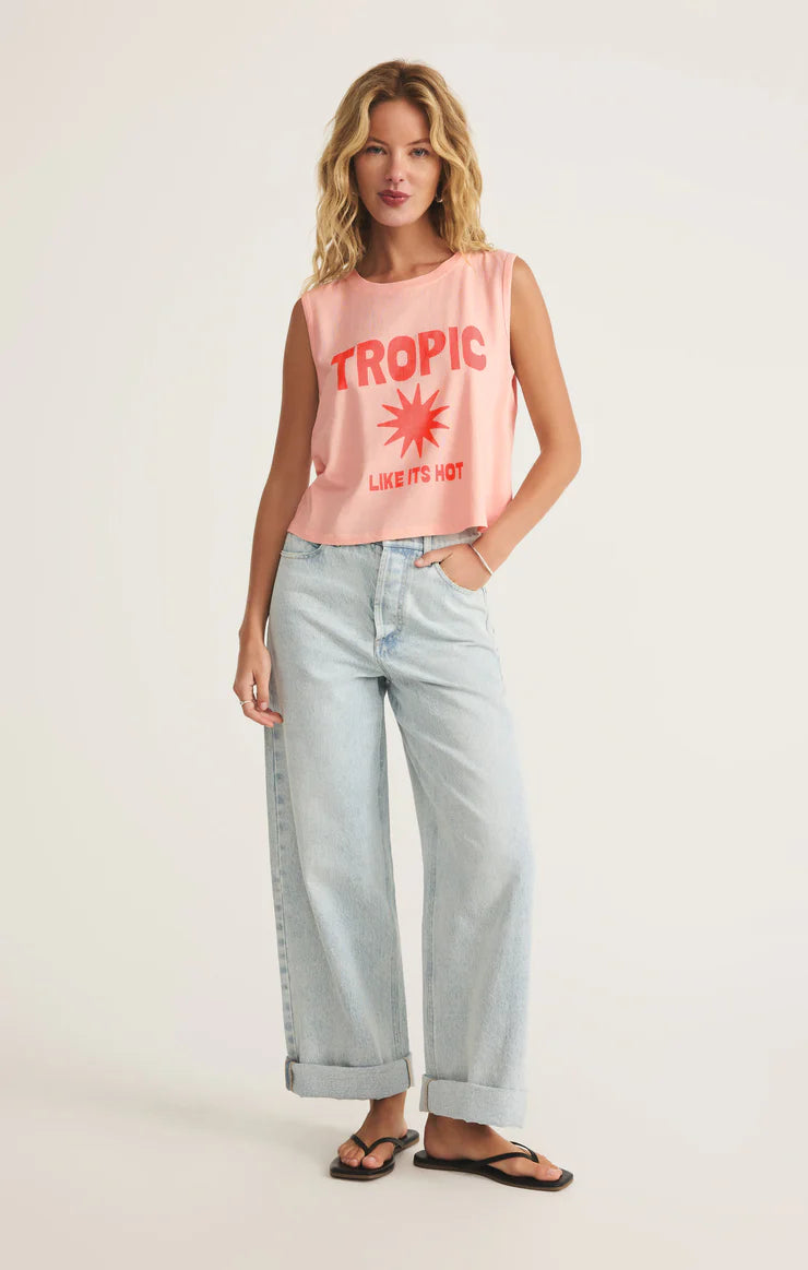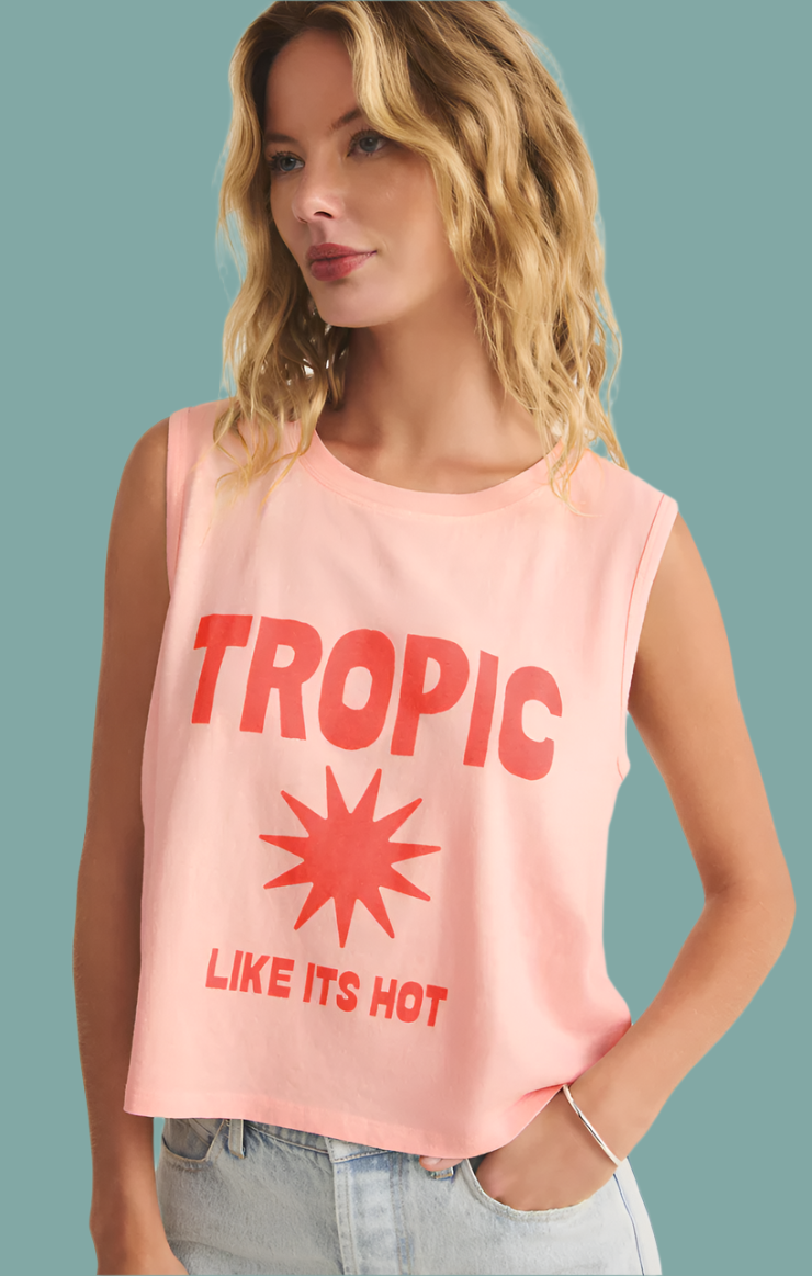 This breezy muscle tank brings laid-back vibes and everyday comfort in soft cotton jersey. Featuring a "Tropic Like It’s Hot" screen print with a sun graphic, it’s the perfect pick for sunshine-filled days.