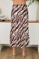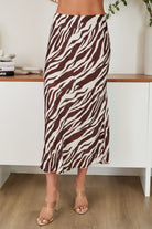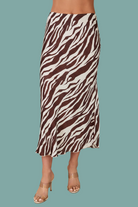 This midi-length silky slip skirt features a subtle no-shadow zebra print in warm brown and cream tones. Its smooth fabric drapes effortlessly for a comfortable fit, making it a versatile piece for casual outings or stylish layering. The unique pattern adds a touch of wild elegance to your everyday wardrobe.