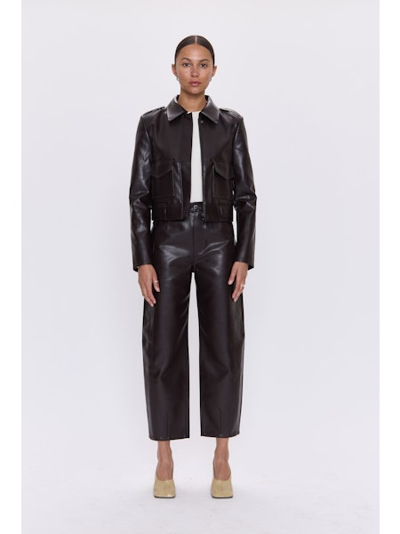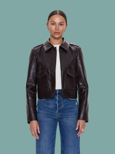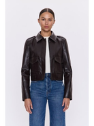 The Bex Shrunken Leather Jacket in French Roast offers a cool, casual vibe with its boxy fit and relaxed hem. It features two front pockets for convenience and a zipper front closure for easy wear. Perfect for layering, this jacket adds effortless style to your everyday look.