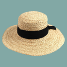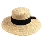 Raffia, Large Flat Brim, wide braid, black ribbon tie in back, elastic tie sweat band, 57 cm