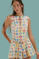Embrace effortless style with the Dune Dancer Printed Romper, a vintage-inspired piece designed to simplify your getting-ready routine. This charming one-piece features a flattering drop-waist silhouette with an adjustable belt, sleeveless boat neckline, and pleated shorts for a polished look. The front zipper closure ensures easy on-and-off convenience, while the soft cotton-blend fabric keeps you comfortable all day long. Perfect for casual outings or weekend adventures.