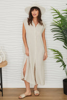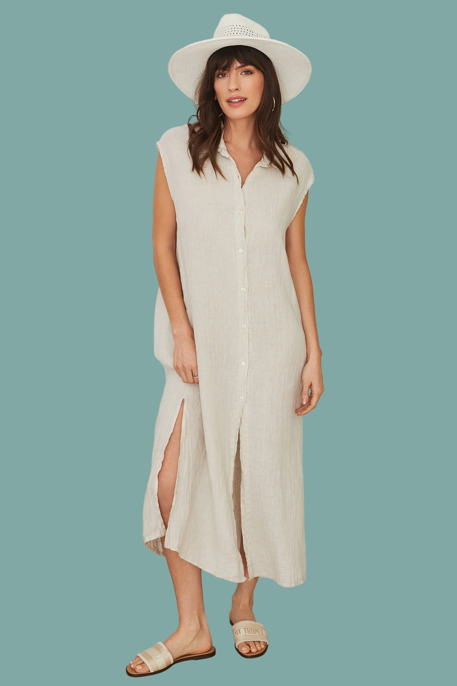 Effortless elegance meets summer comfort in this lightweight linen shirt dress. The sleeveless design keeps you cool while the relaxed crinkle texture adds natural dimension and visual interest. Perfect for layering or wearing solo, this versatile piece transitions seamlessly from casual weekends to dressed-up occasions. The generous length provides coverage and movement, making it ideal for warm weather adventures. Pair it with sneakers for a laid-back vibe or dress it up with sandals and accessories for an elevated look.