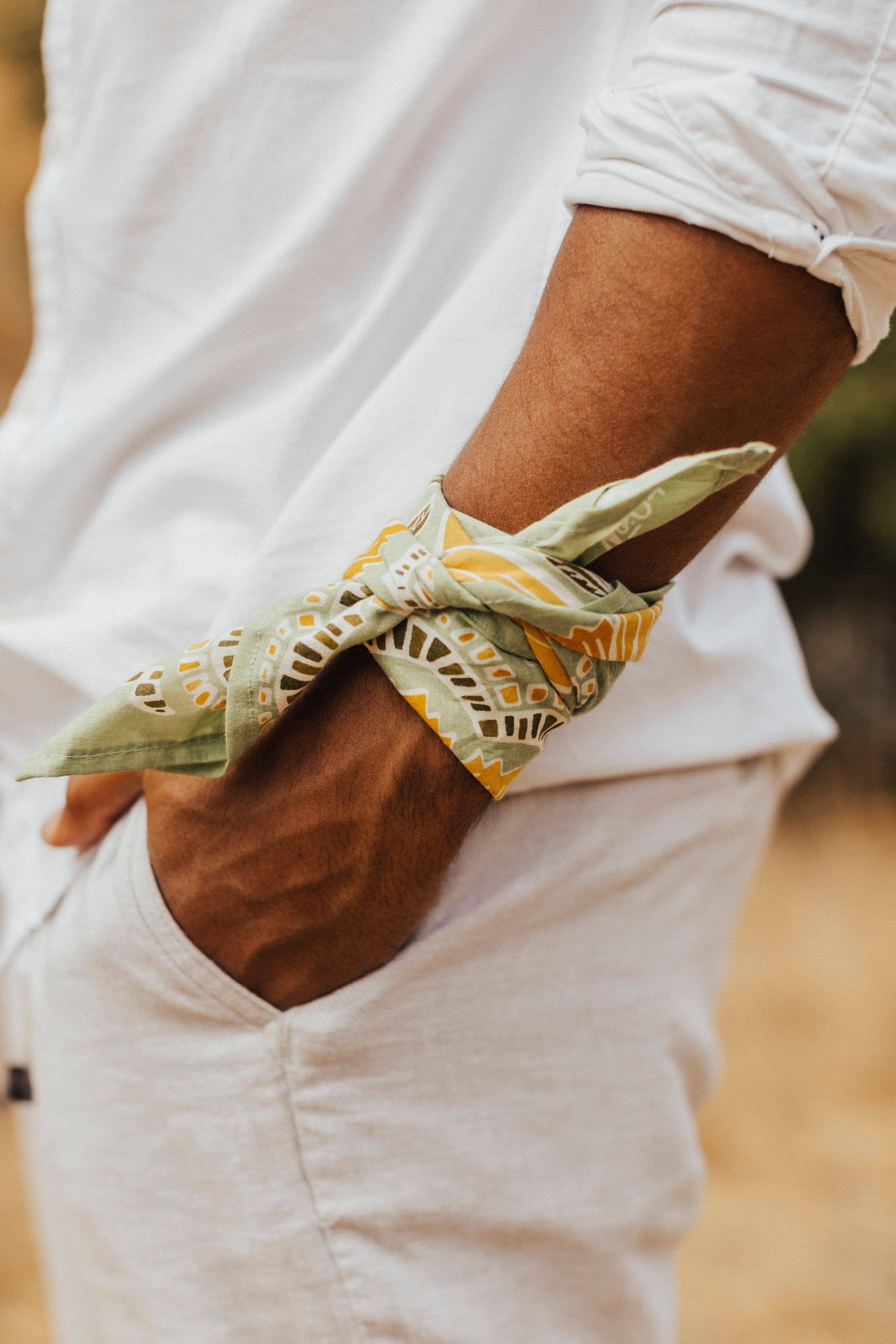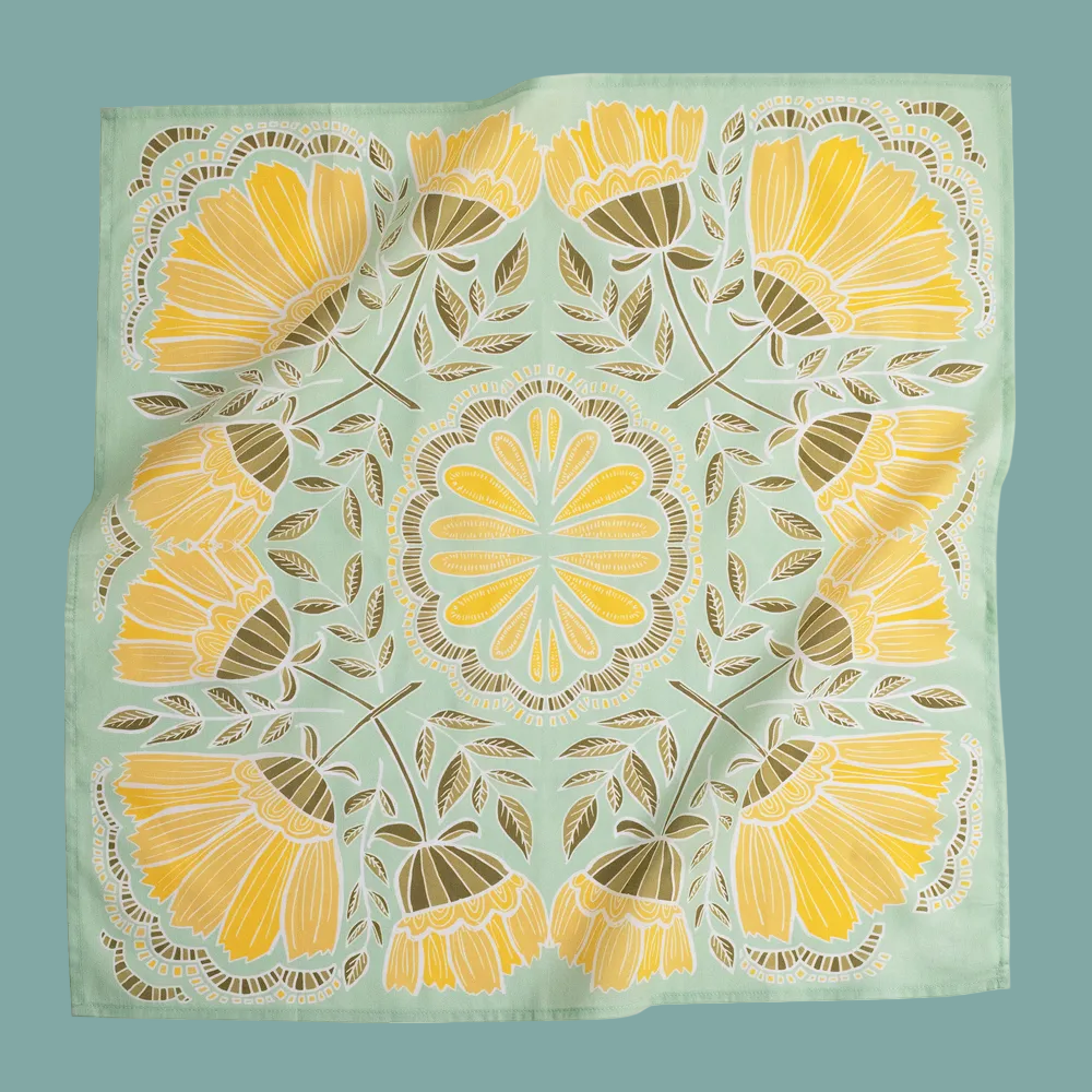 Color & Pattern: Light green with yellow flowers Material: 100% premium cotton Sizing: 22x22 inches Designed in the U.S. Hand screen-printed in India A bandana can be used in so many different ways! Use it as a handkerchief on hikes, wear it in your hair or on your clothes to spice up an outfit, or tie it around your pup's neck to make them look dashing. Have fun with it!