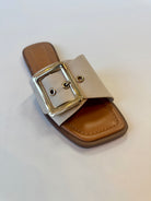Step into effortless style with the Opera Buckle Sandal, featuring a sleek vegan leather upper paired with an eye-catching oversized gold buckle. Perfect for warm weather adventures, this versatile sandal transitions seamlessly from casual outings to weekend getaways. The comfortable design keeps your feet happy all day long, while the statement buckle adds just the right touch of polish to any outfit. Sustainably crafted without compromising on style or comfort.