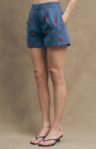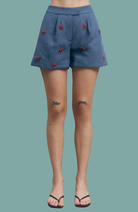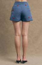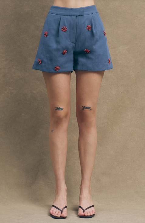 Roma Shorts bring effortless style with a flattering peplum silhouette in dark denim. Adorned with vibrant red beaded floral details that catch the light, these shorts feature functional pockets for everyday convenience. The playful peplum hem adds movement and dimension, making them perfect for casual outings or weekend adventures. Comfortable, chic, and ready to pair with your favorite tees and sneakers.