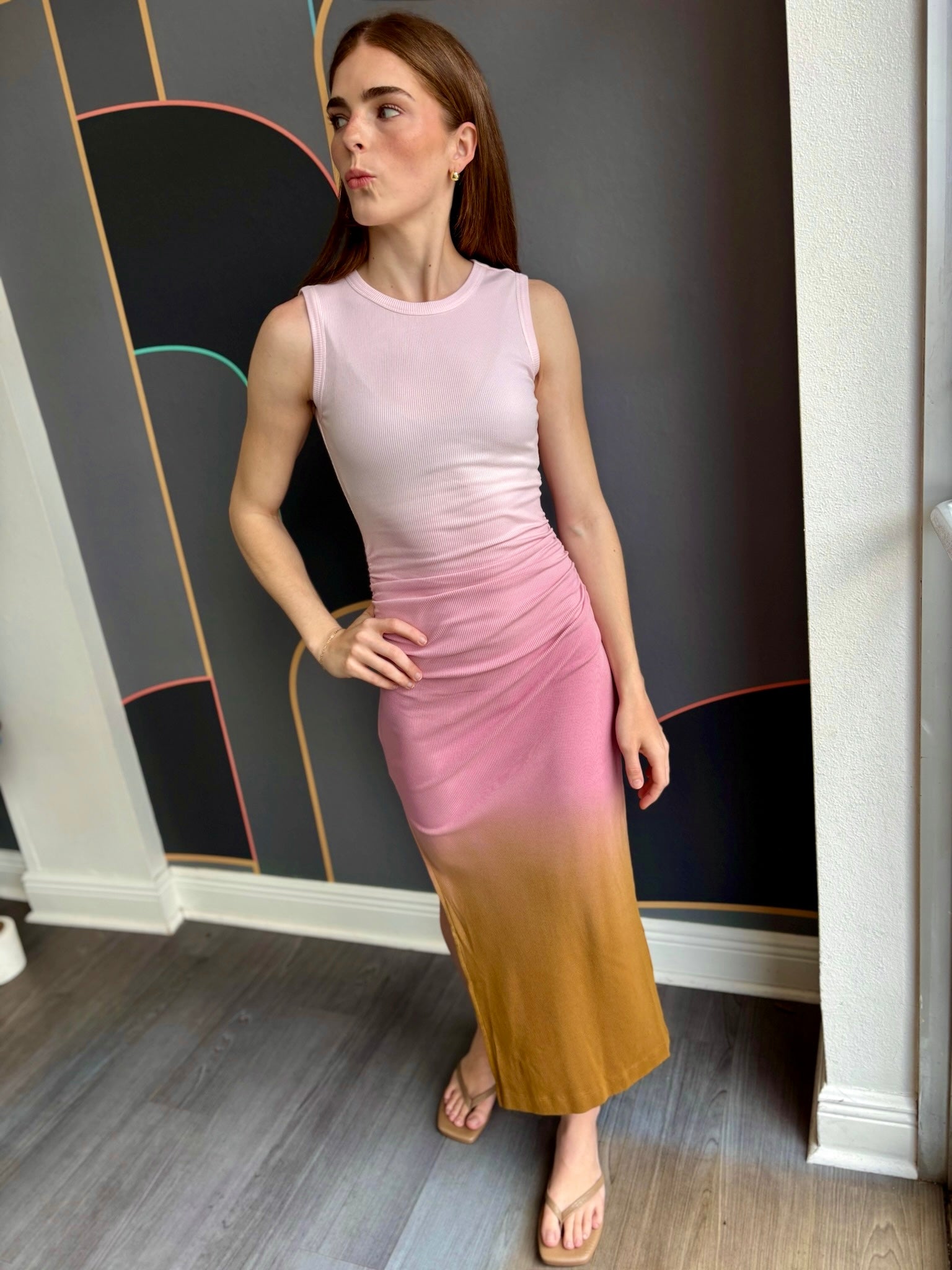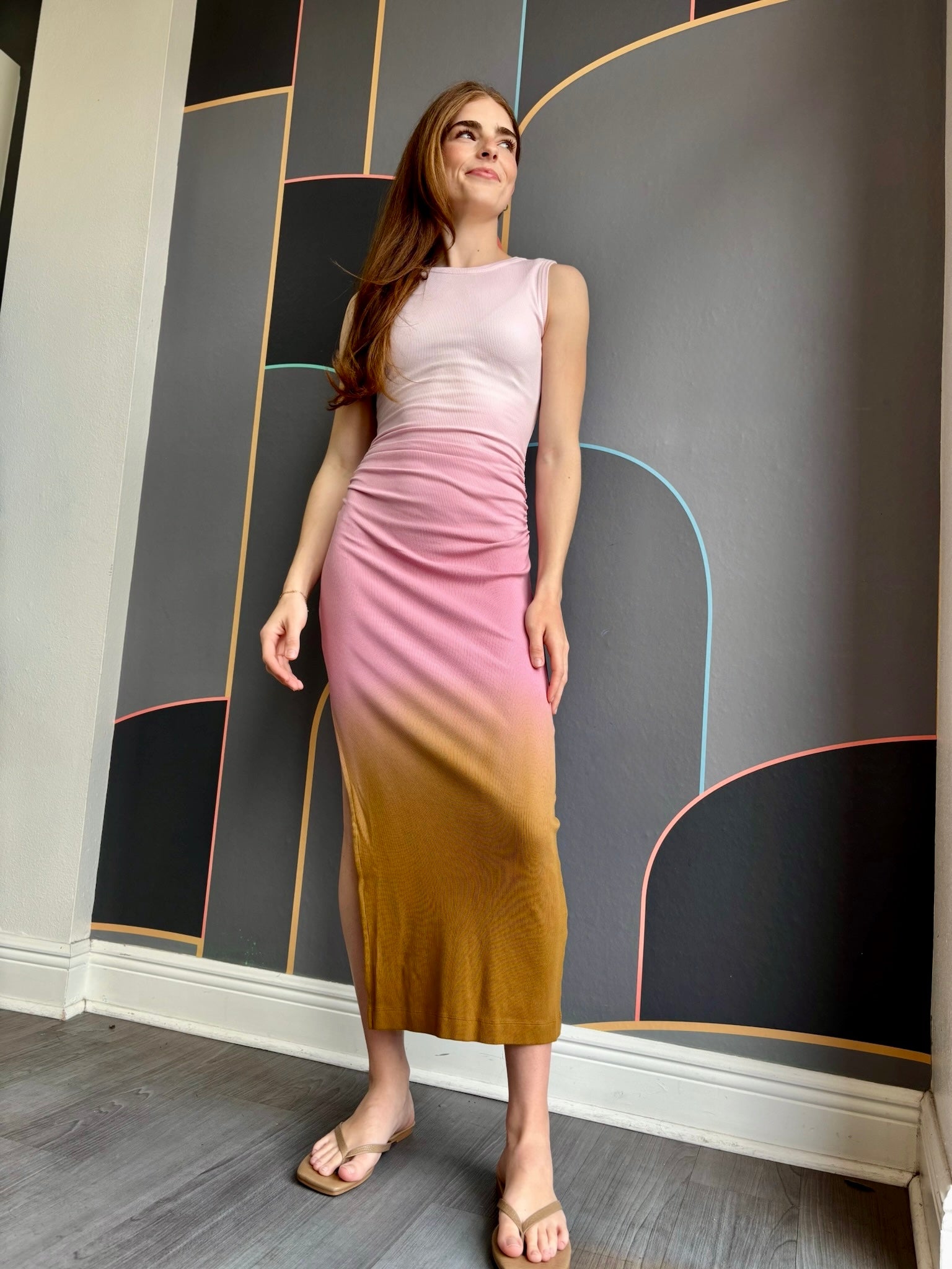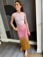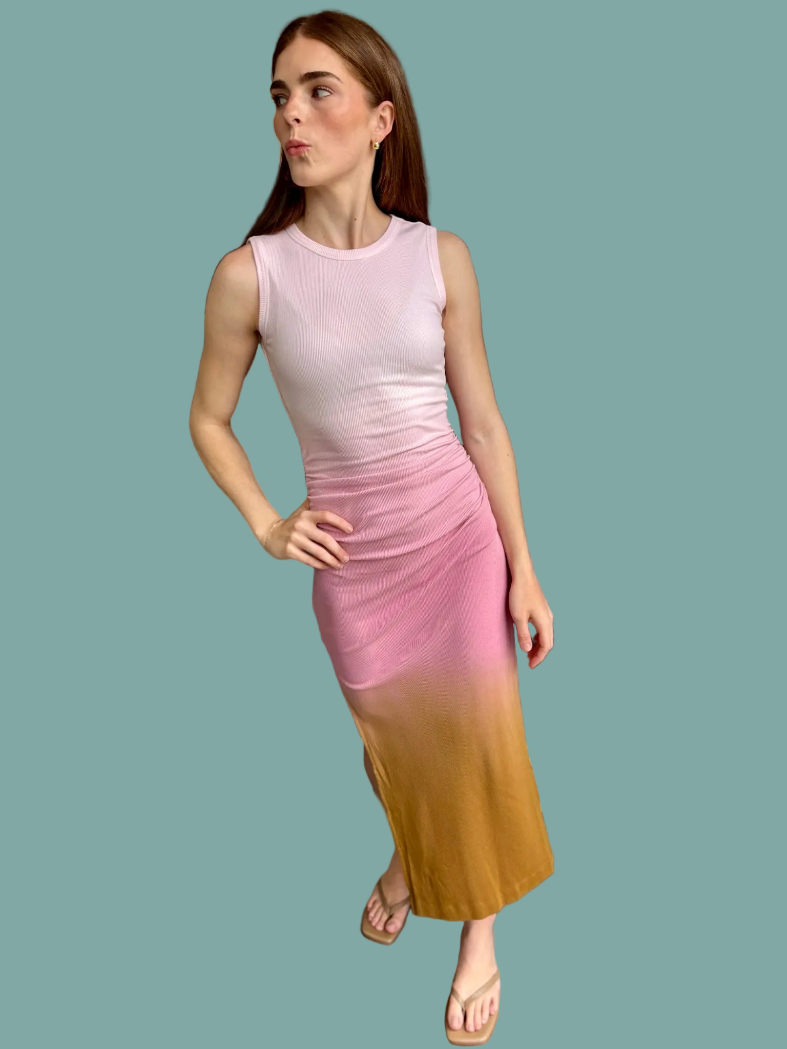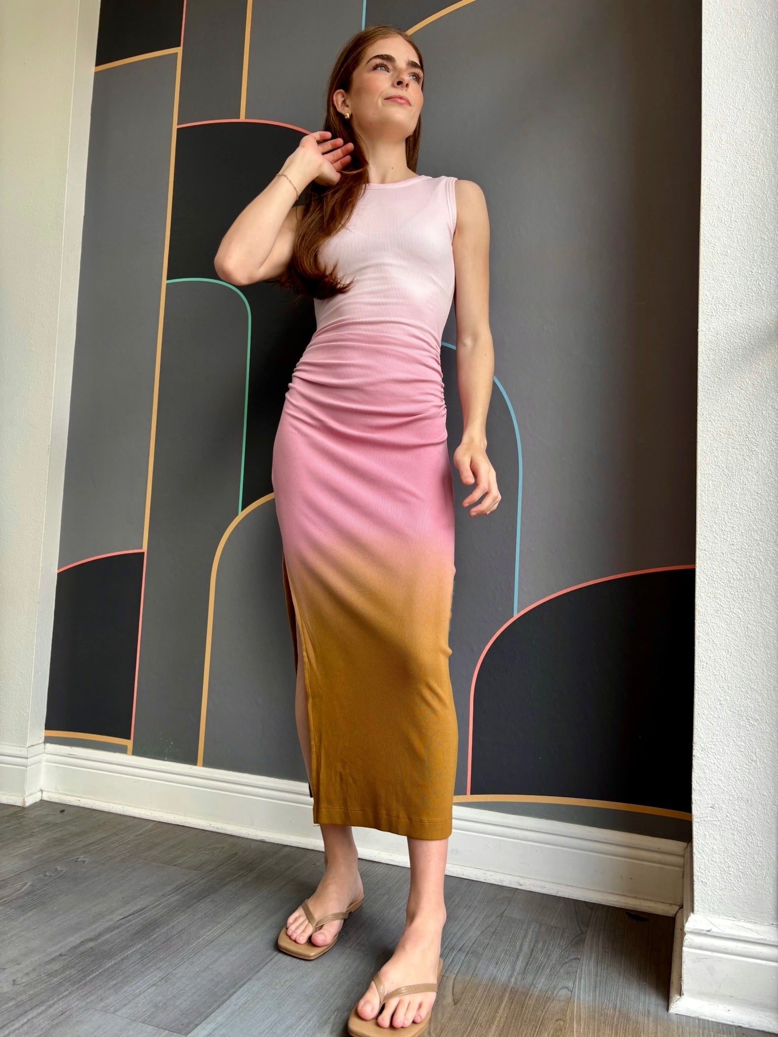 The Tamara Dress blends effortless comfort with bold color, making it a must-have for warm-weather dressing. Crafted in a soft, body-skimming knit, this sleeveless maxi silhouette features a crew neckline and a straight skirt with a subtle side slit for easy movement. The vibrant dip-dye wash gives it a distinctly vacation-ready vibe—perfect for beach days, holiday outings, and casual, party-ready summer style.