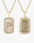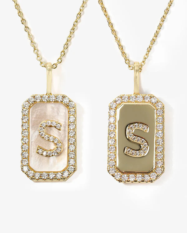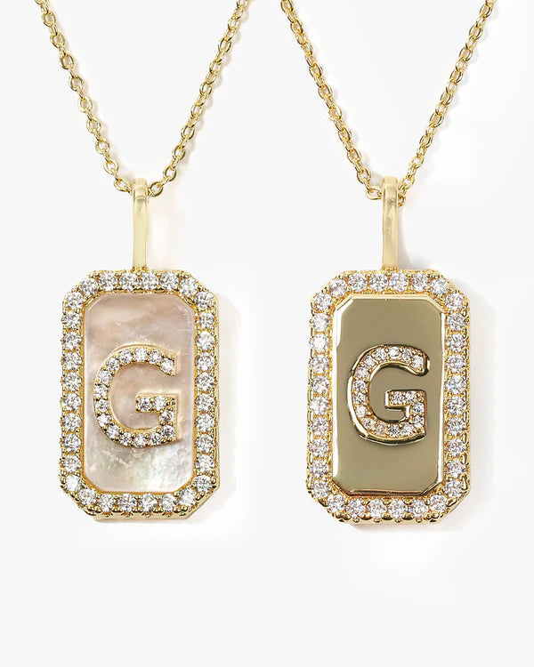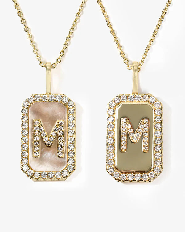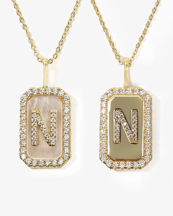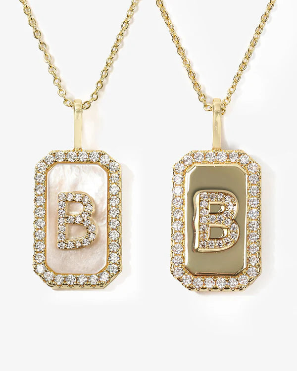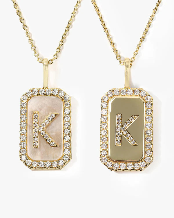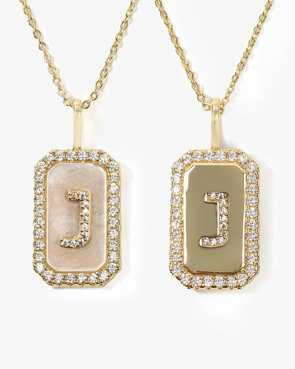 Wear it your way. The Love Letters Double-Sided Necklace combines some of our favorite features: dog tag + mother of pearl + pavé diamond initials = We're OBSESSED. And it's double sided?!?! That is Next Level.