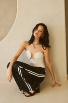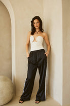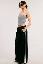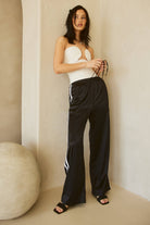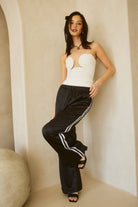 These satin-effect track pants blend sporty style with casual comfort. They come in a full-length design with a drawstring elastic waistband, white side stripes for a stylish contrast, two side pockets, and a straight-leg cut for easy movement.