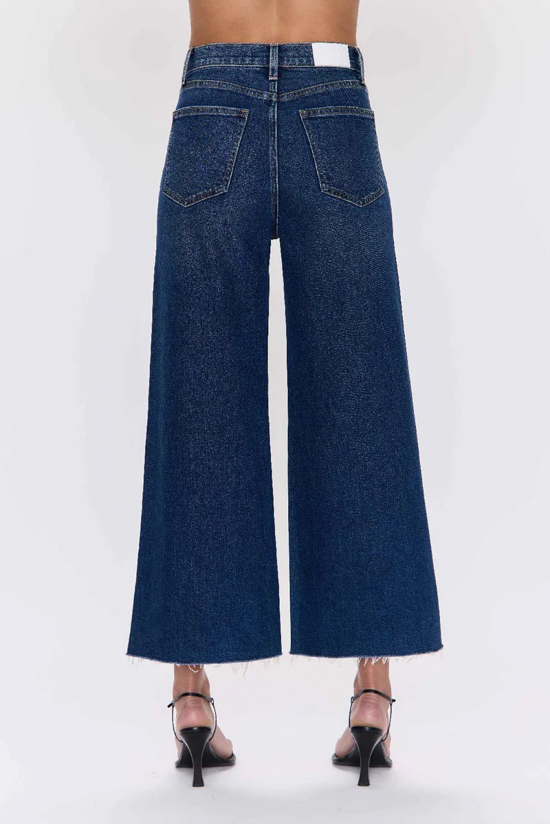 A relaxed, ultra wide leg silhouette featuring a raw finished hem and wide, stitched cuffs. Crafted from our signature comfort stretch denim to provide a structured shape with just the right give.