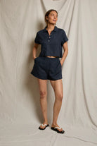 the malin short is the embodiment of warm weather ease. we designed them with a relaxed wide-leg opening, flat front pockets and a finished hem that keeps it polished. the high-rise smocked elastic waistband provides a flexible fit and gathered effect, pairing it perfectly with any tee.