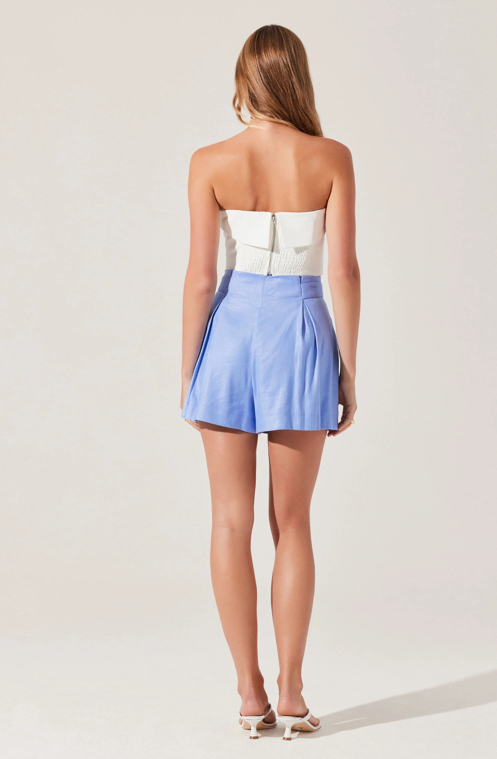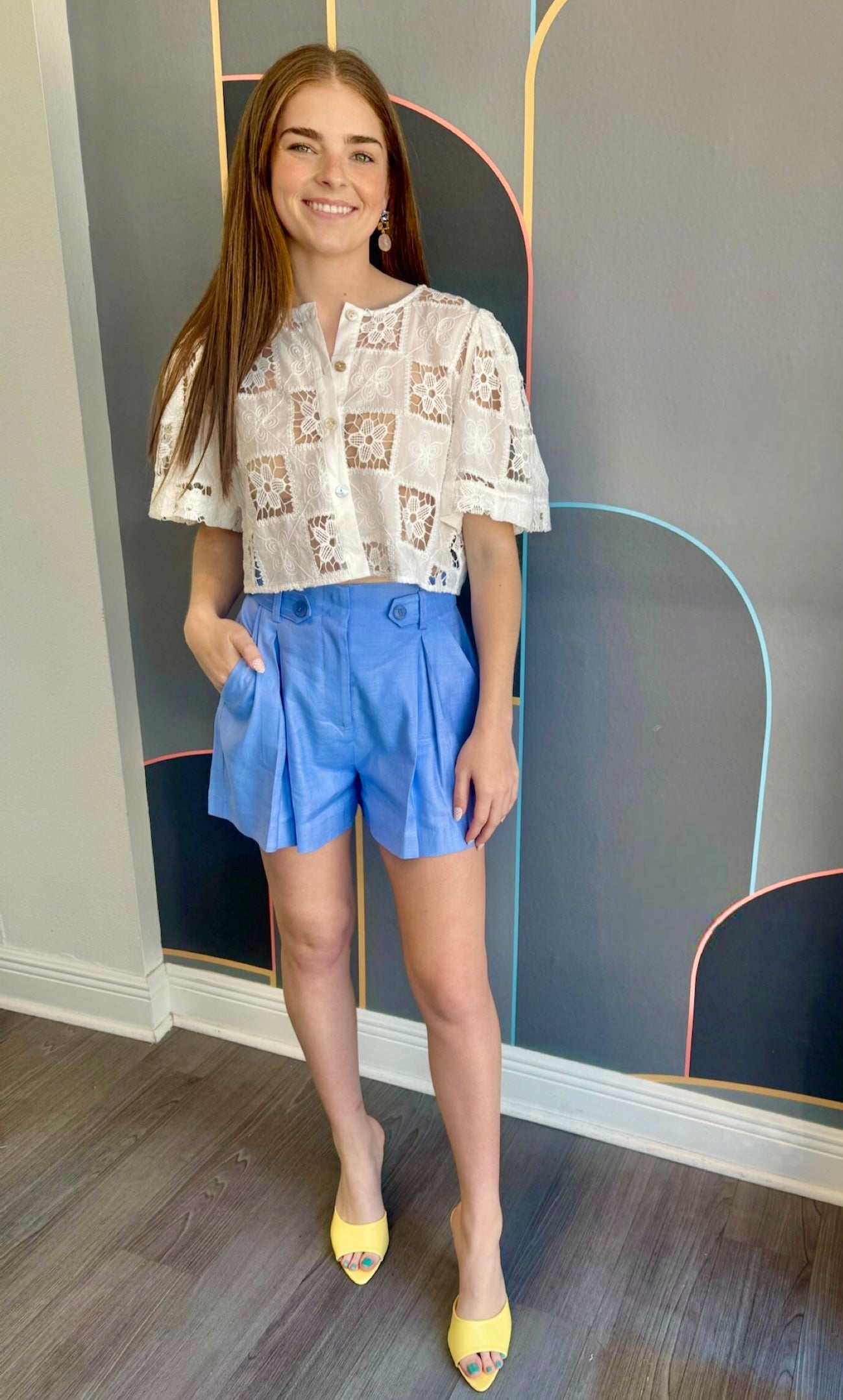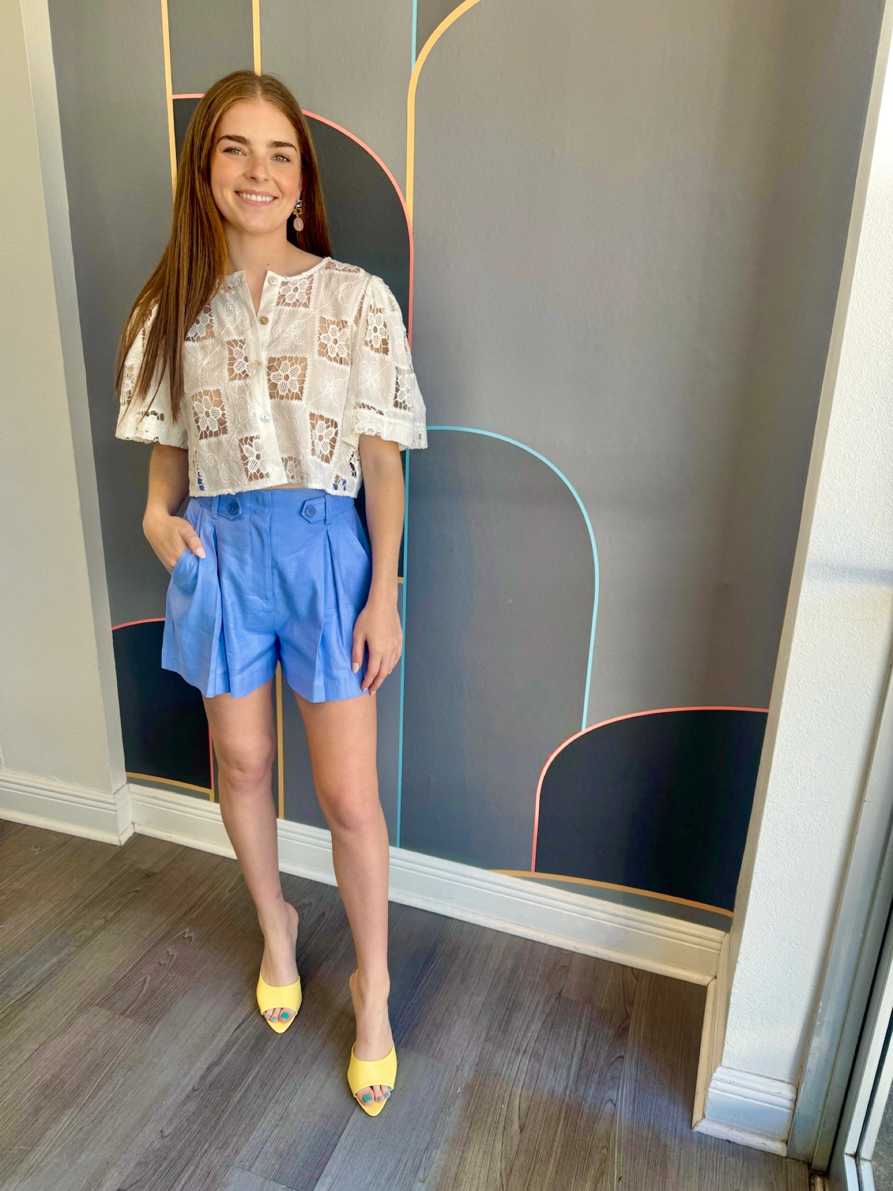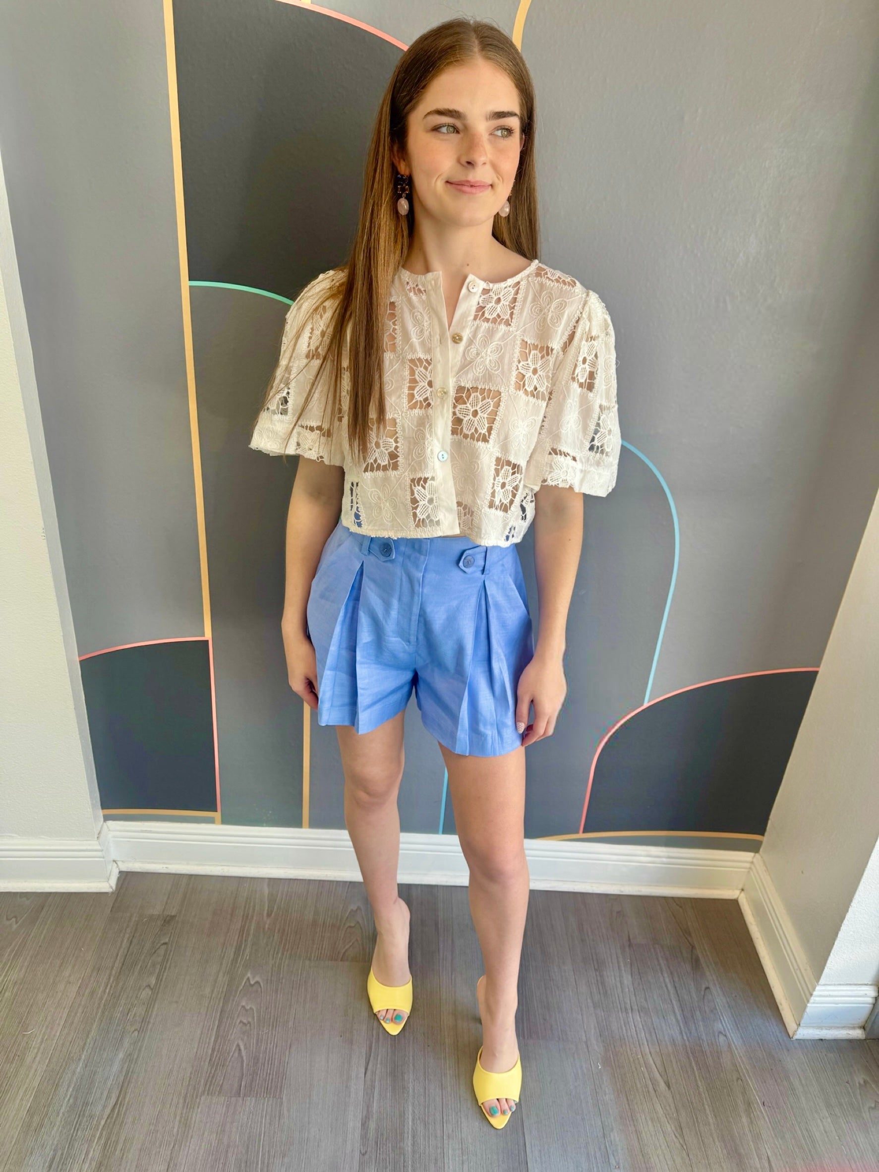 Stay cool and stylish with our Ollie Shorts. Made with a pleated linen blend, these shorts feature functional side pockets and decorative button detail for added flair. The concealed front zipper and hook closure ensure a secure fit, while the dry clean only fabric keeps them looking sharp.