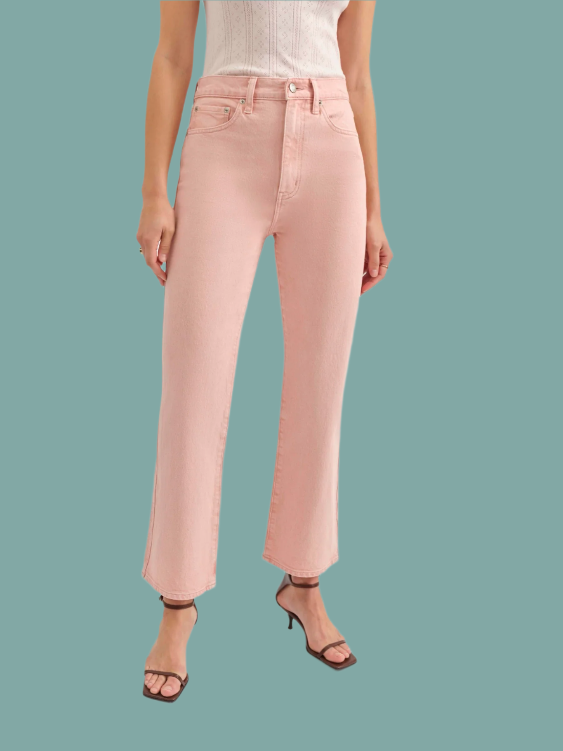 Introducing the Daze ultra high rise jeans in a soft pastel pink hue. The structured flare and ankle length are crafted from their Just Right denim, offering the perfect blend of rigidity and stretch. With a comfortable 11 3/4" rise and 28 1/2" inseam, elevate your style in luxury and comfort.