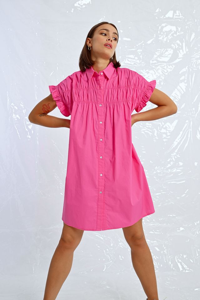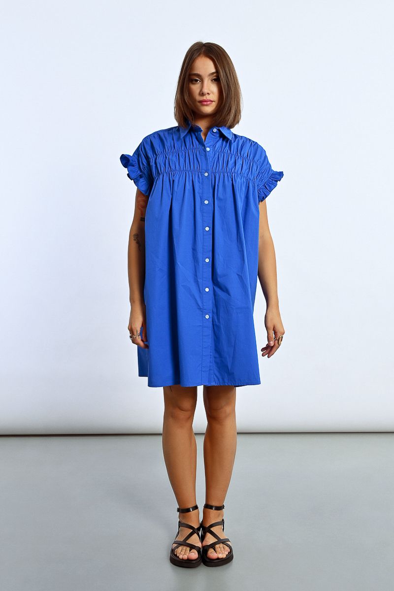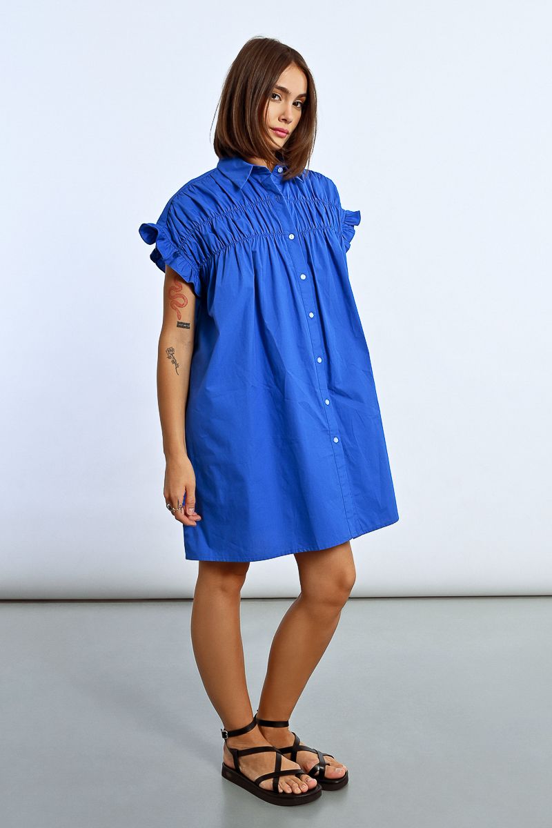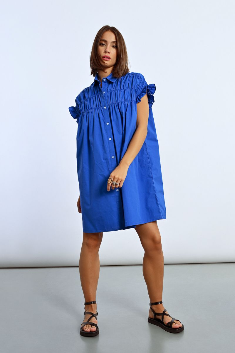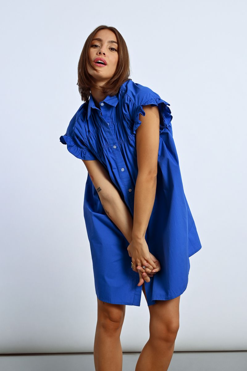 This tunic shirt dress features playful ruffle cap sleeves and a ruched front for added flair. In a stunning royal blue and pink, this dress will make you feel like a queen at any event.