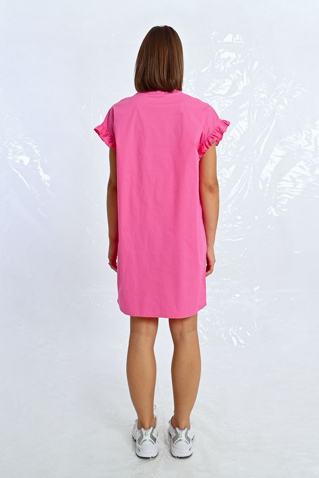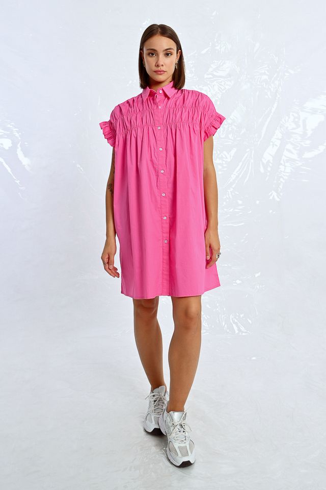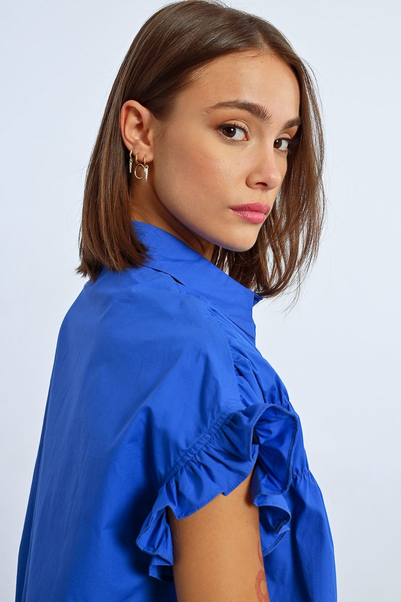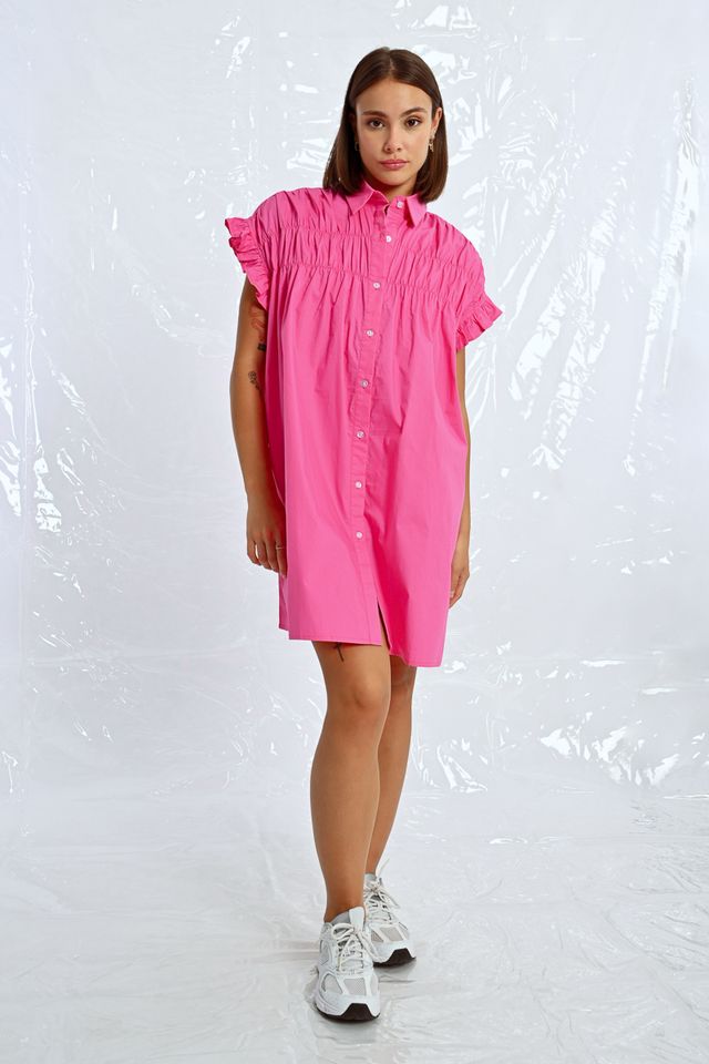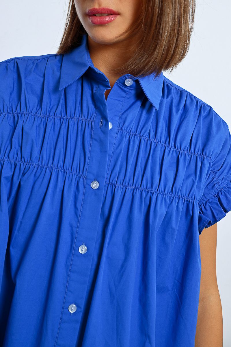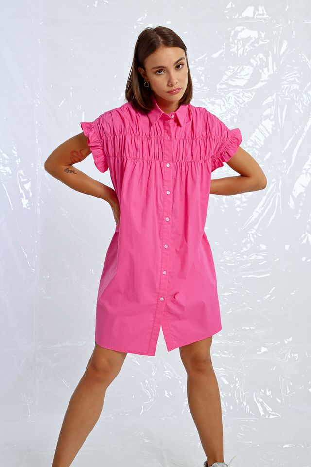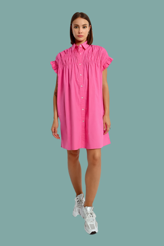 This tunic shirt dress features playful ruffle cap sleeves and a ruched front for added flair. In a stunning royal blue and pink, this dress will make you feel like a queen at any event.