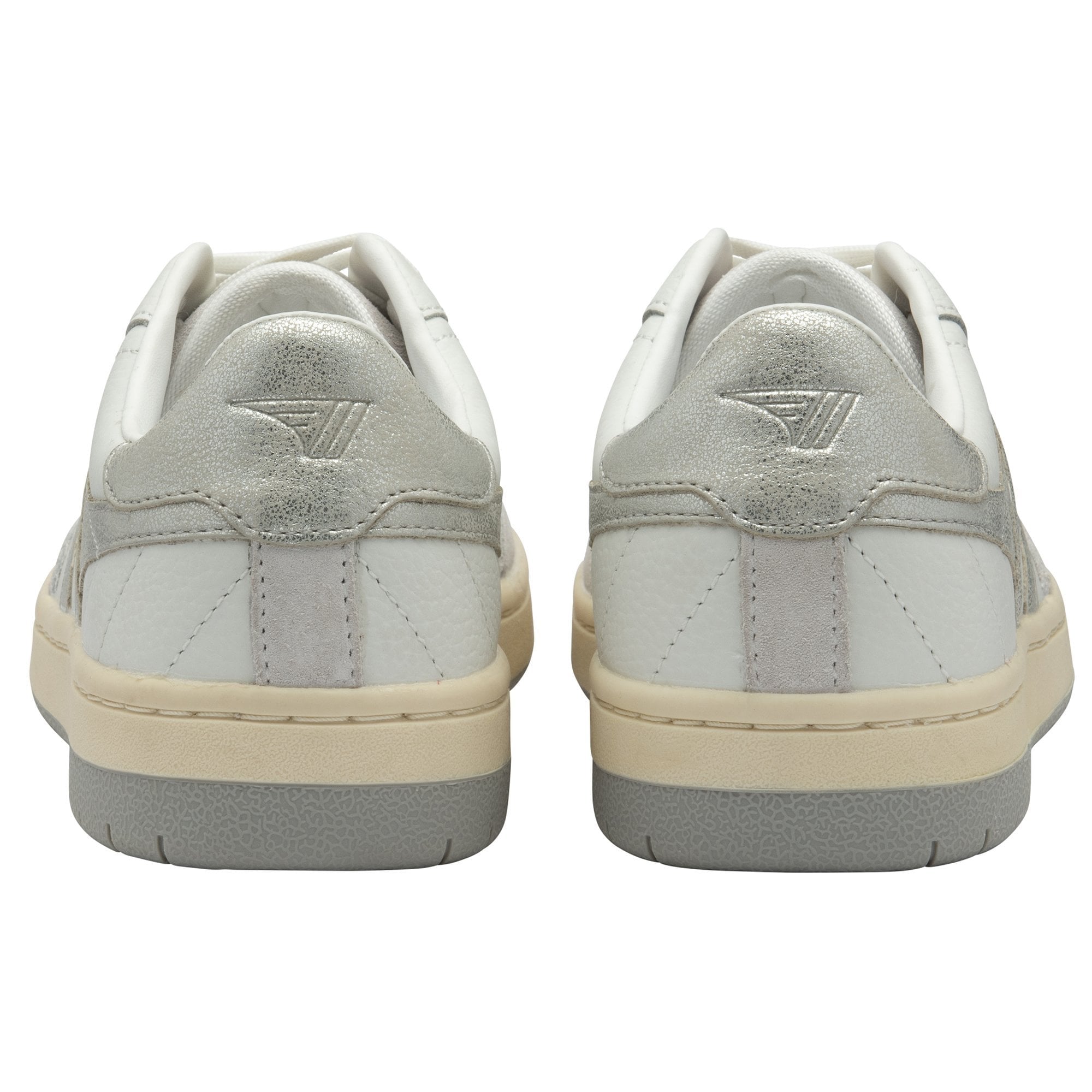 Taking a metallic twist, Falcon Mirror in white/silver is a versatile women’s sneaker that looks equally comfortable with off duty looks or tailored trousers. Sat on a white leather upper, the silver metallic Gola wingflash highlights to the sides of this classic Gola women’s sneaker ooze contemporary chic with relaxed tennis credibility and a warm nostalgia. Finished with a coordinating grey highlight outsole, Gola’s Falcon Mirror offers perennial chic sneaker looks effortlessly.