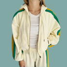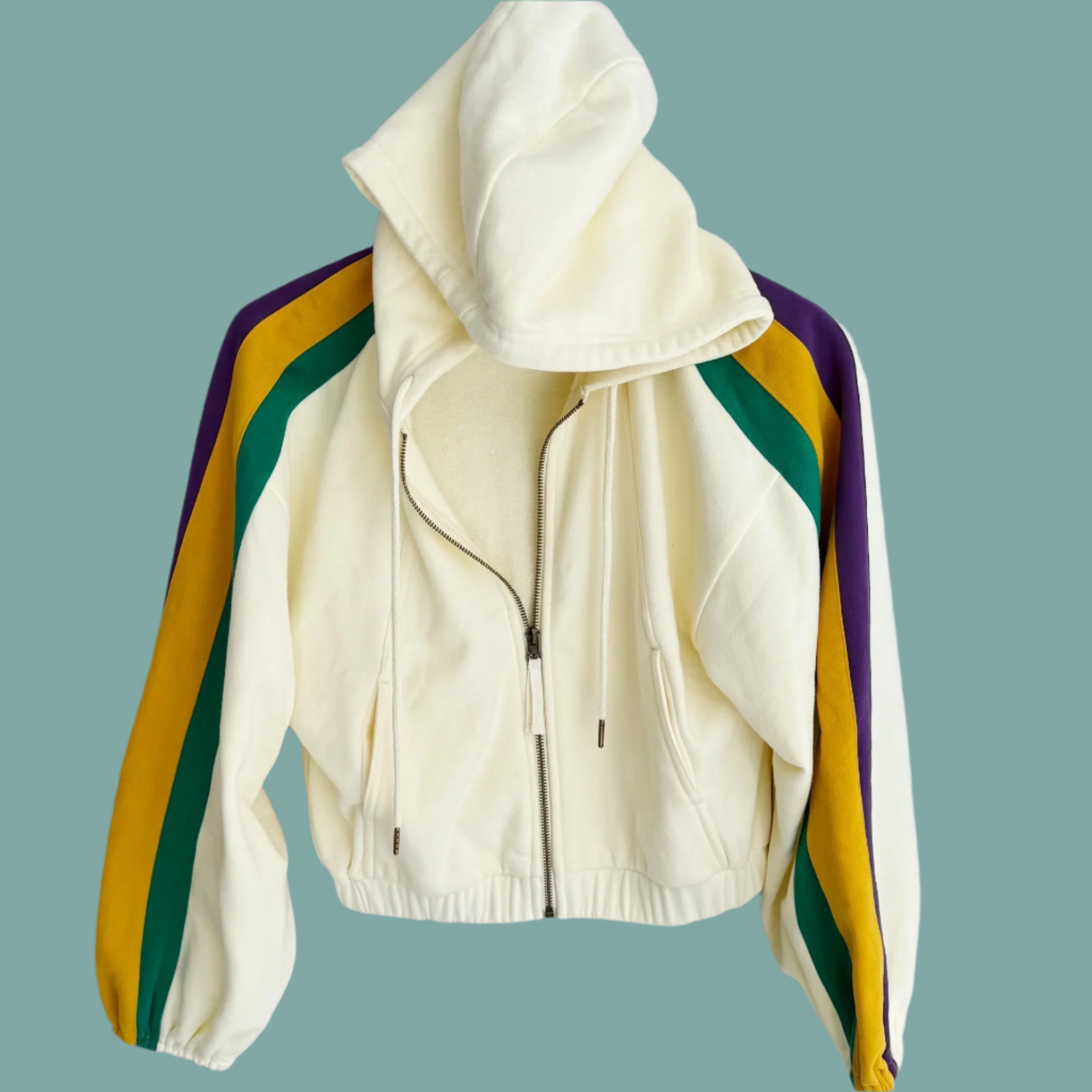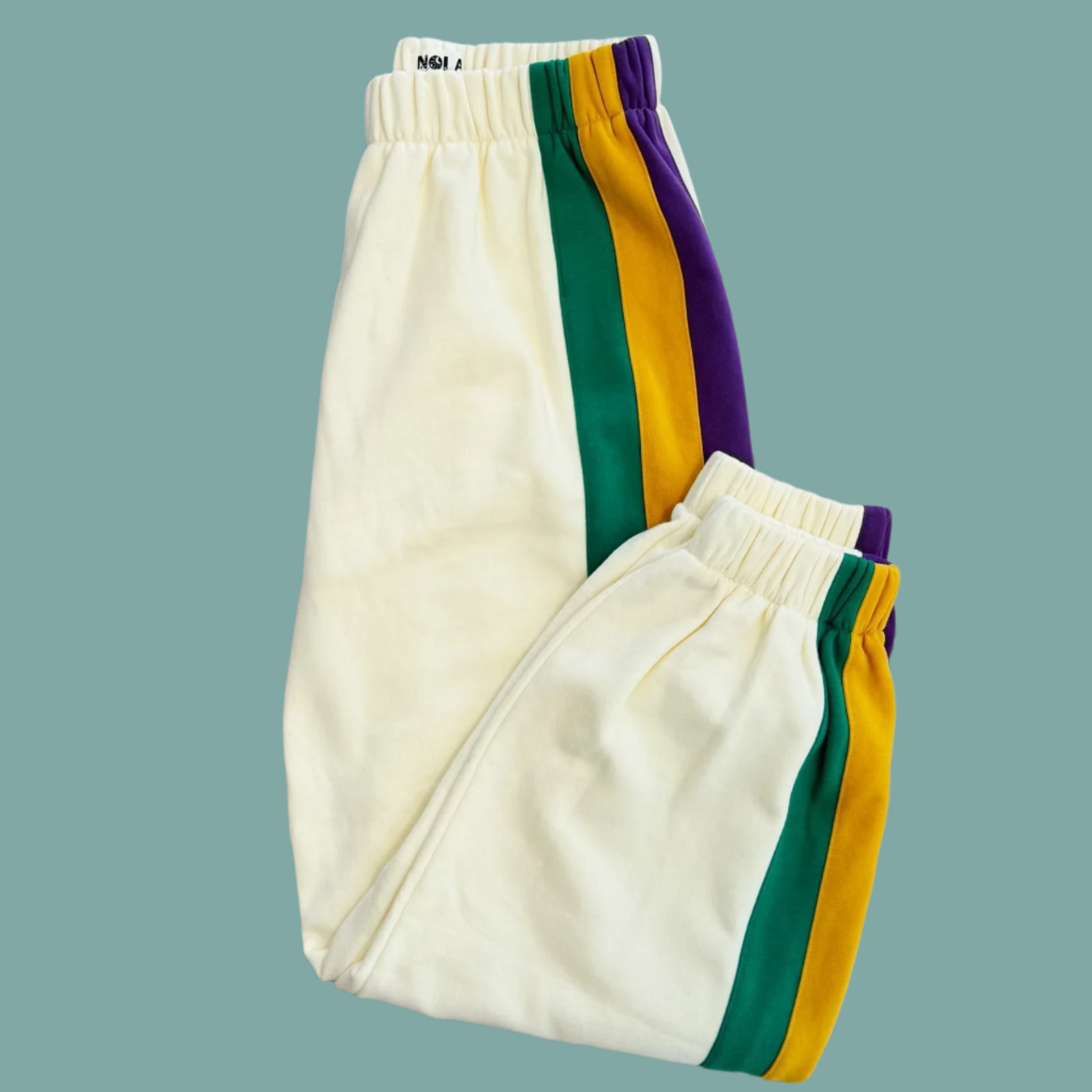Get ready to party with the Mardi Nation Set! This matching mardi gras set includes a full zip hoodie with functioning drawstrings and joggers. A purple, green, and gold stripe adds a festive touch to the arms and legs. Sold as a set.