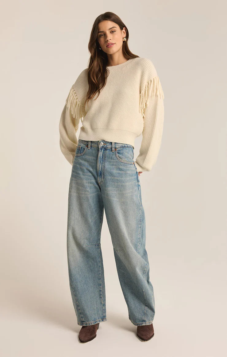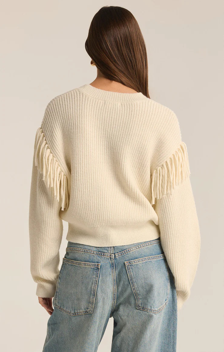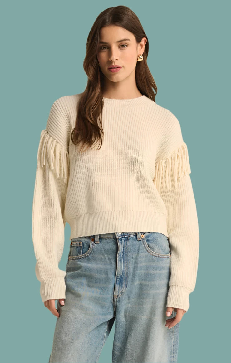 Elevate your wardrobe with this crew neck sweater. The long sleeves and unique fringe detail at the shoulders add a touch of vintage flair to your cozy essentials. Hand wash and reshape for a long-lasting midweight fit.