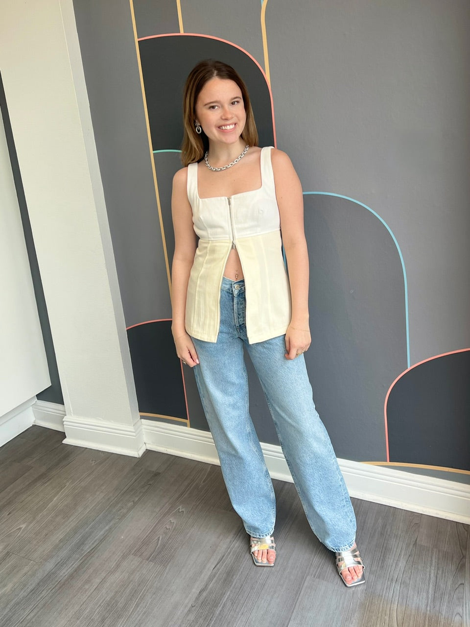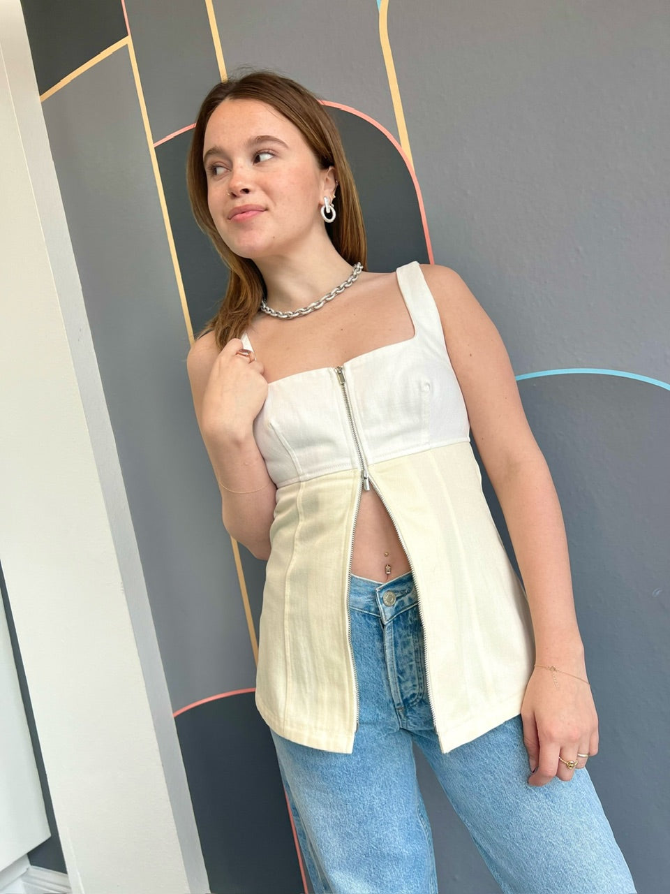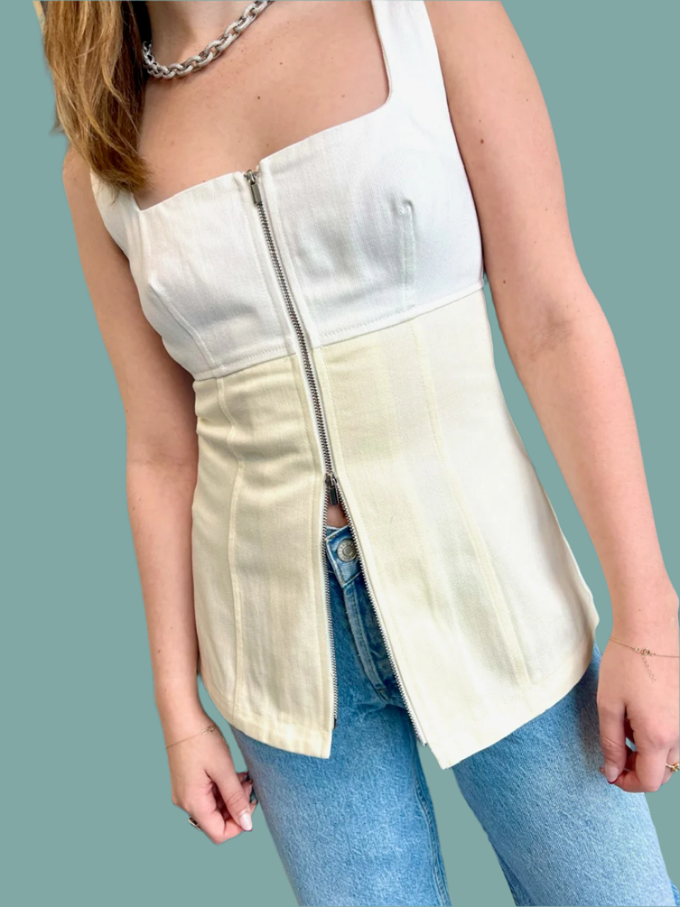 Get ready to stand out with the Chicago Top! This two toned white and beige top features a middle zipper and is made from 100% cotton with a denim-like texture. Perfect for a casual yet stylish look.