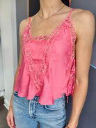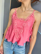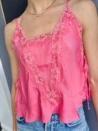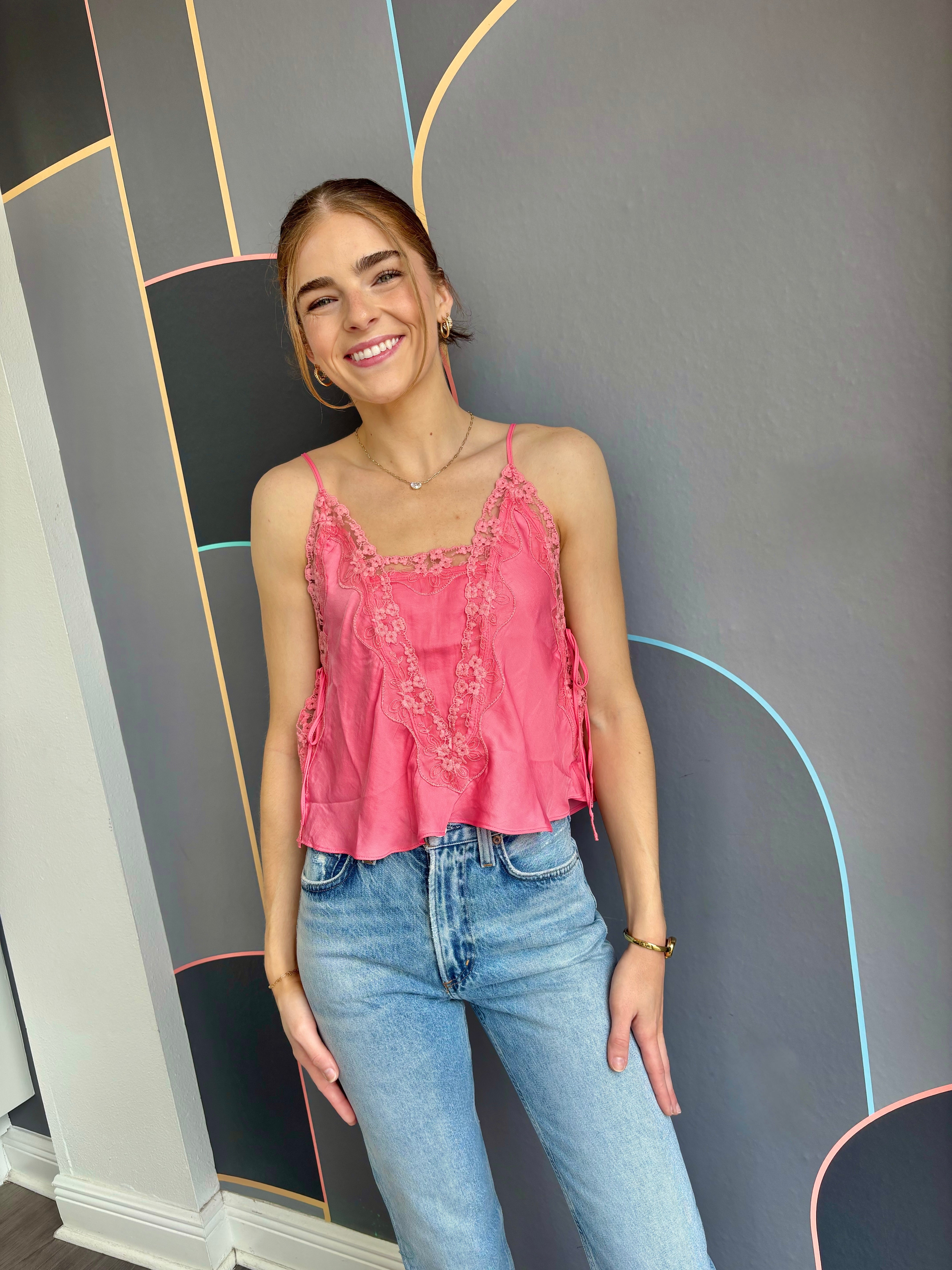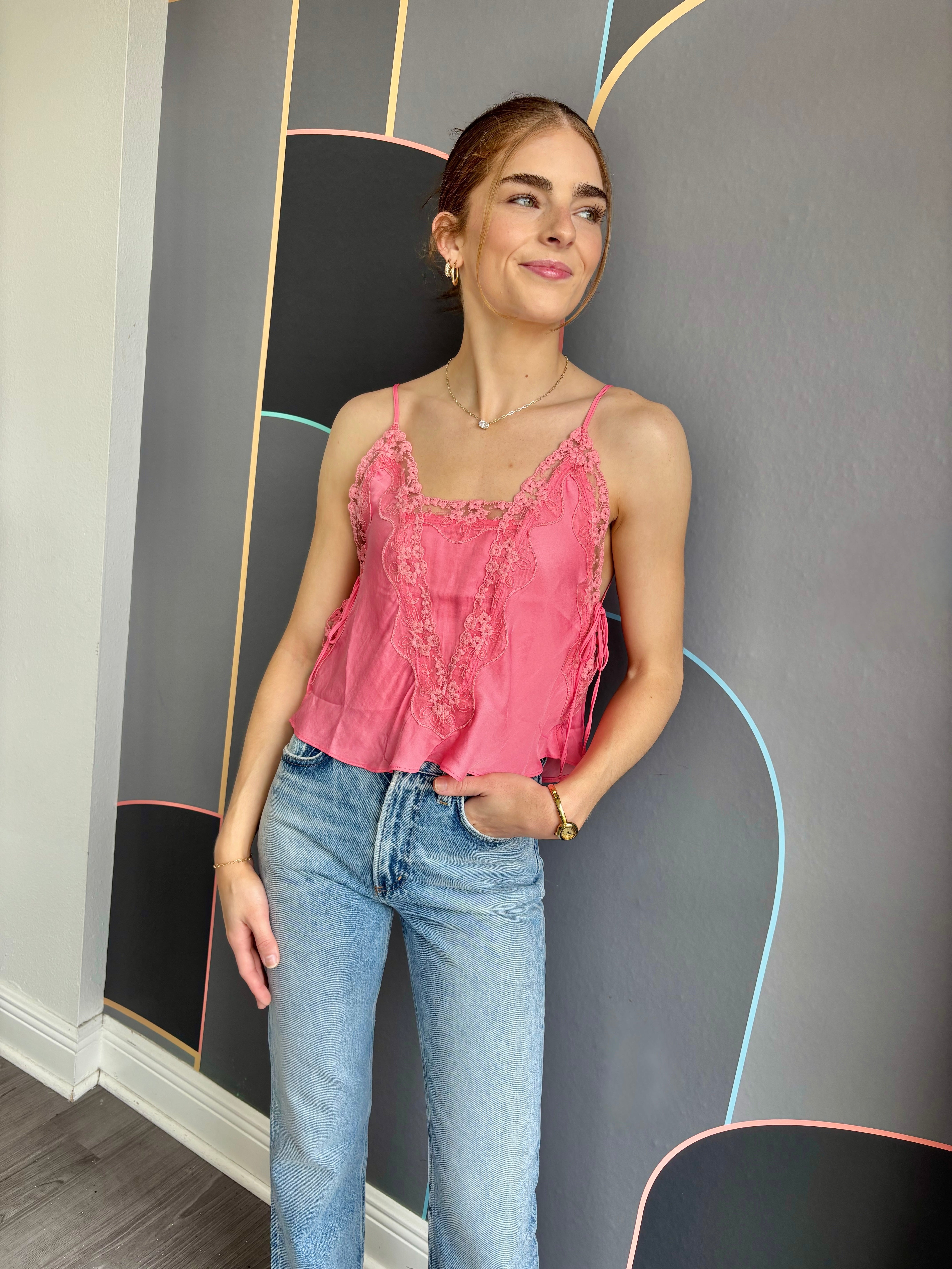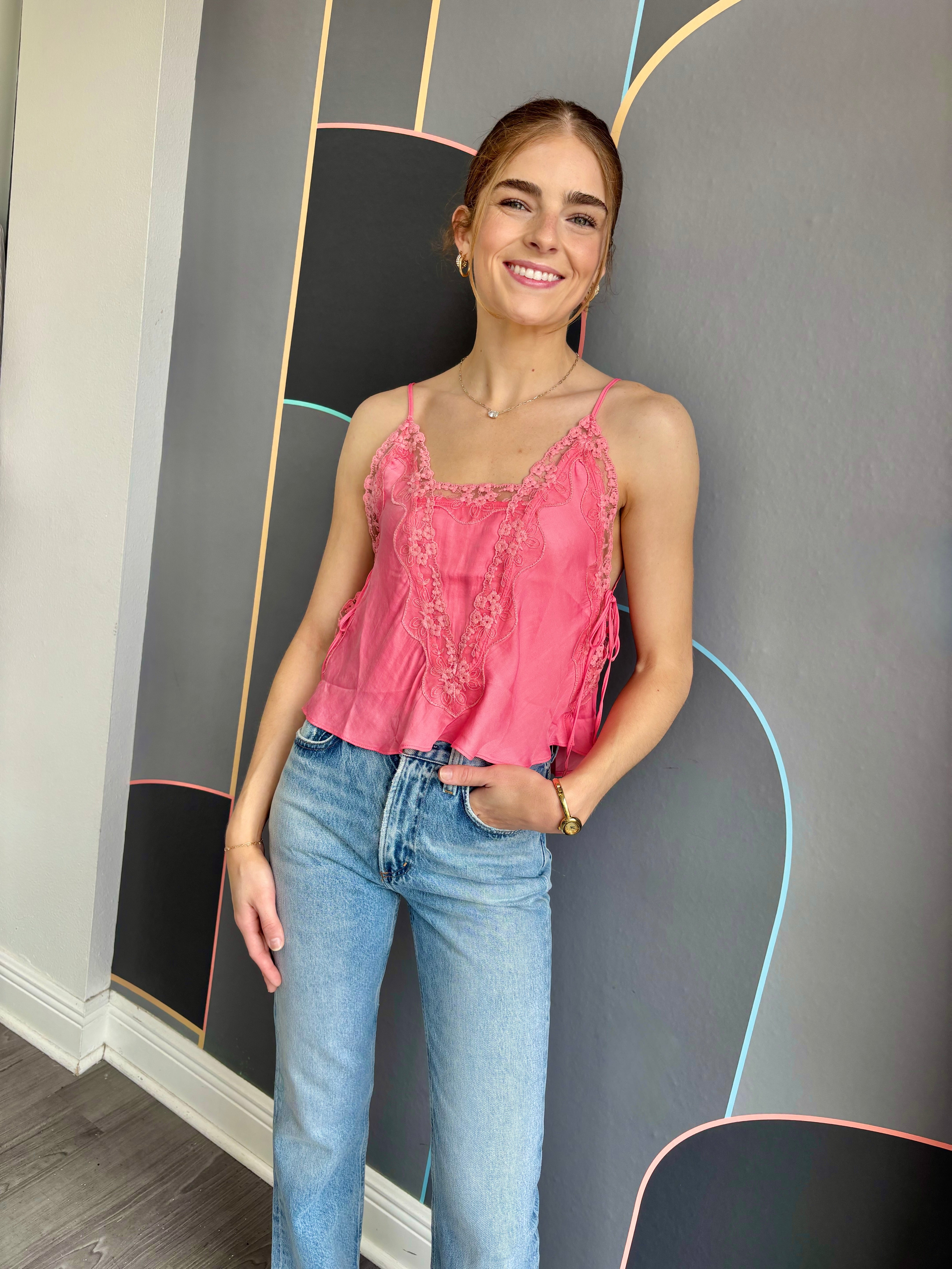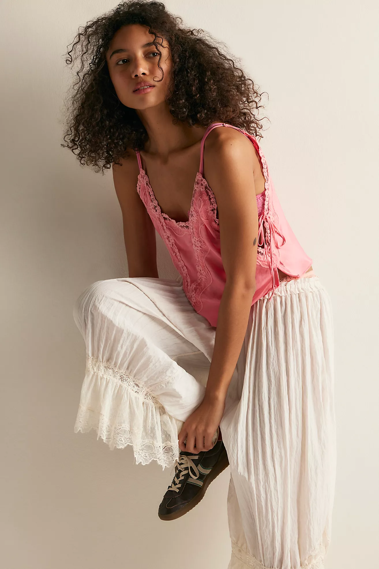 Add a lovely layer to your look with this sweet cami, adorned with sheer lace trim throughout. Features adjustable straps, ribbon ties on the sides, and split hems for a flattering silhouette. The subtle V-neckline at the back adds an elegant touch. Part of Intimately, our in-house collection of the softest intimates and best-ever base layers designed for comfort and style.