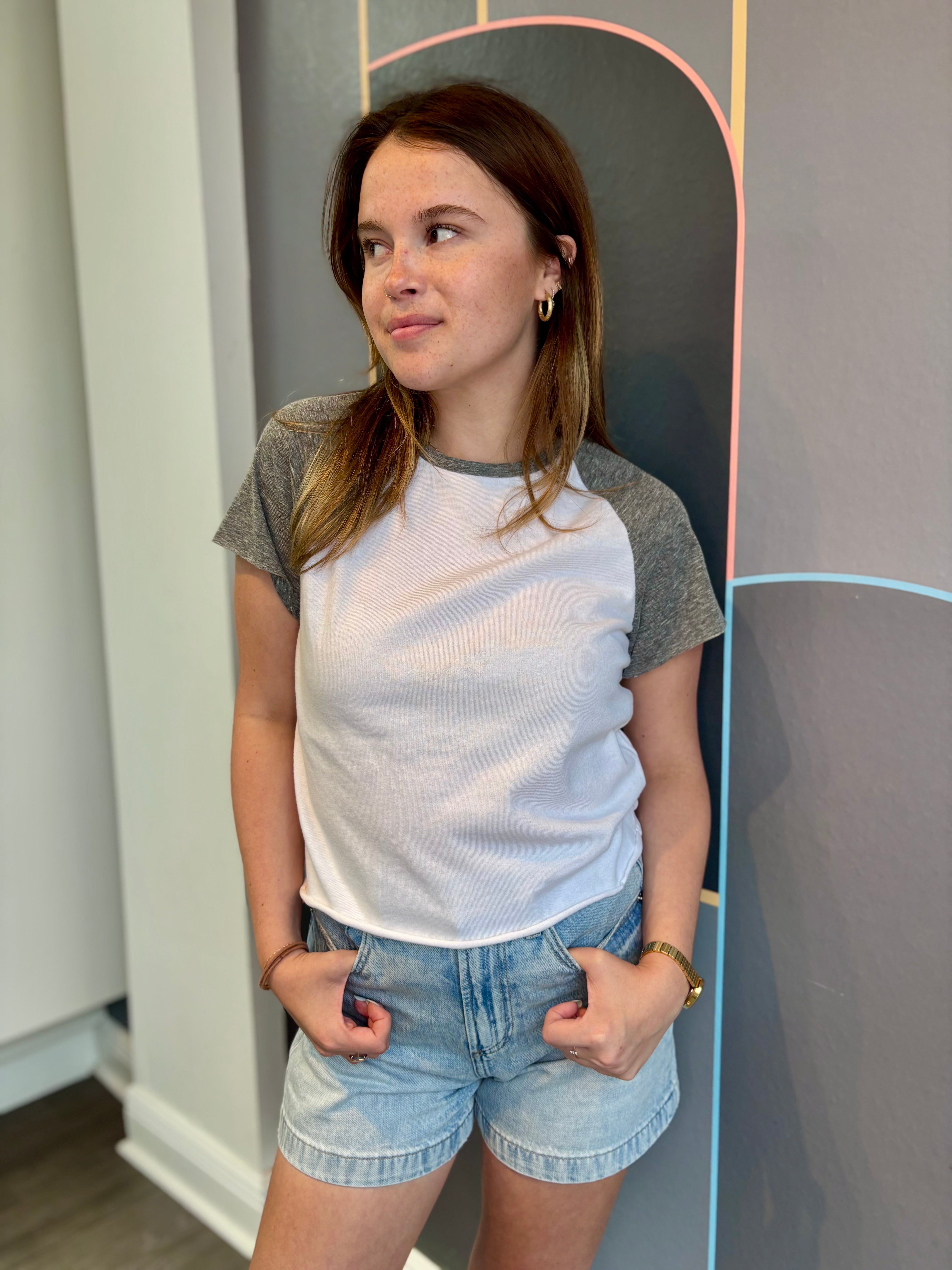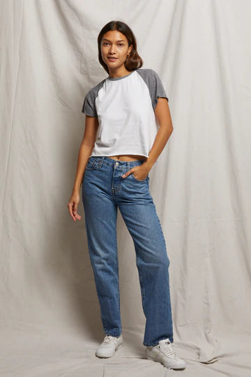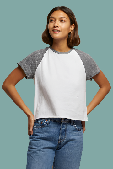 Embrace retro charm and modern comfort with the Britt Vintage Soft Cotton Jersey Tee. Featuring a unique color block design with opposite toned panels, this tee stands out in style. Made from 100% cotton (heather grey: 100% cotton, contrast: 38% cotton / 50% polyester / 12% viscose), it's soft and breathable, with a slightly cropped and fitted silhouette.