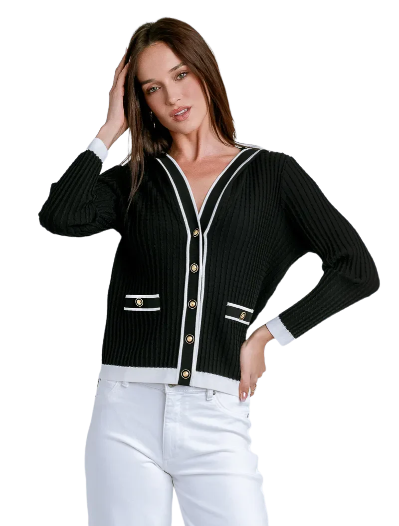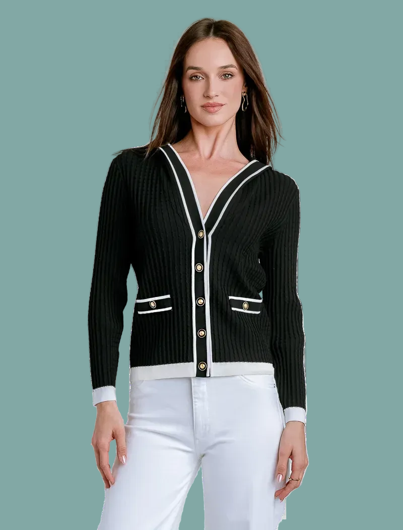 Elevate your everyday wardrobe with the Caboto Cardigan, a timeless knitted piece featuring classic ribbed texture. This sophisticated black cardigan is accented with crisp white trim and polished gold buttons, creating an effortlessly chic look. Perfect for layering over dresses, tees, or worn solo, it transitions seamlessly from office to weekend. The quality construction ensures lasting comfort and style season after season.