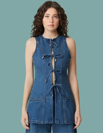 Elevate your casual style with the Clara Sleeveless Top from Curaae by Elliatt. Made from soft and durable denim, this top features a flattering fit and an adjustable tie-up front for a customizable look. Perfect for layering, this top adds effortless cool to any outfit.