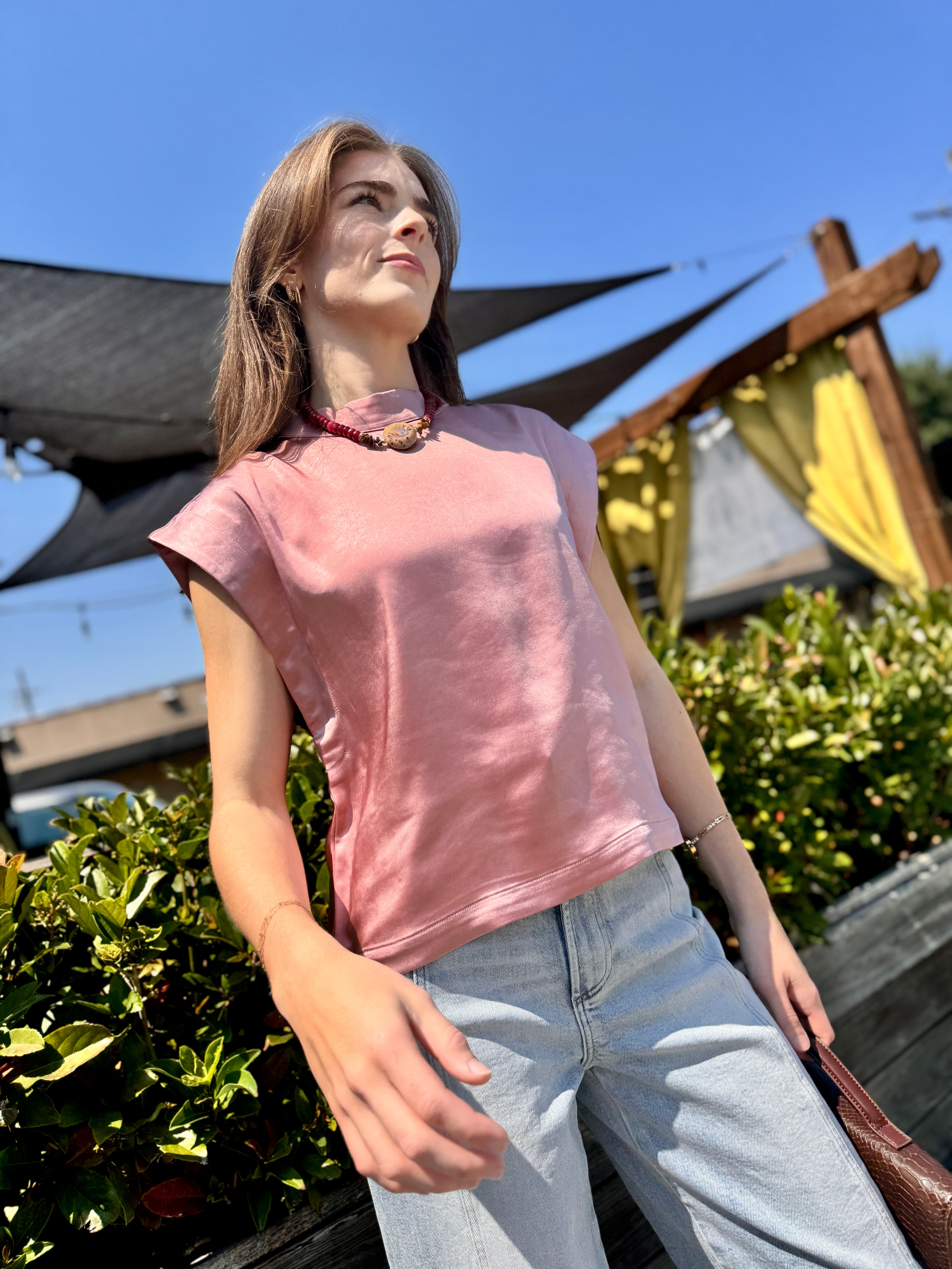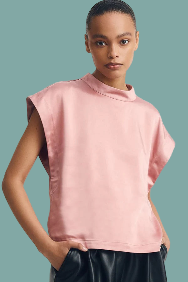 The Julian Top features a sleek boxy silhouette with a sleeveless design and a mock neck, crafted from smooth 100% polyester satin. Its relaxed fit and lustrous fabric offer comfortable wear with a polished, casual look perfect for both day and evening occasions.
