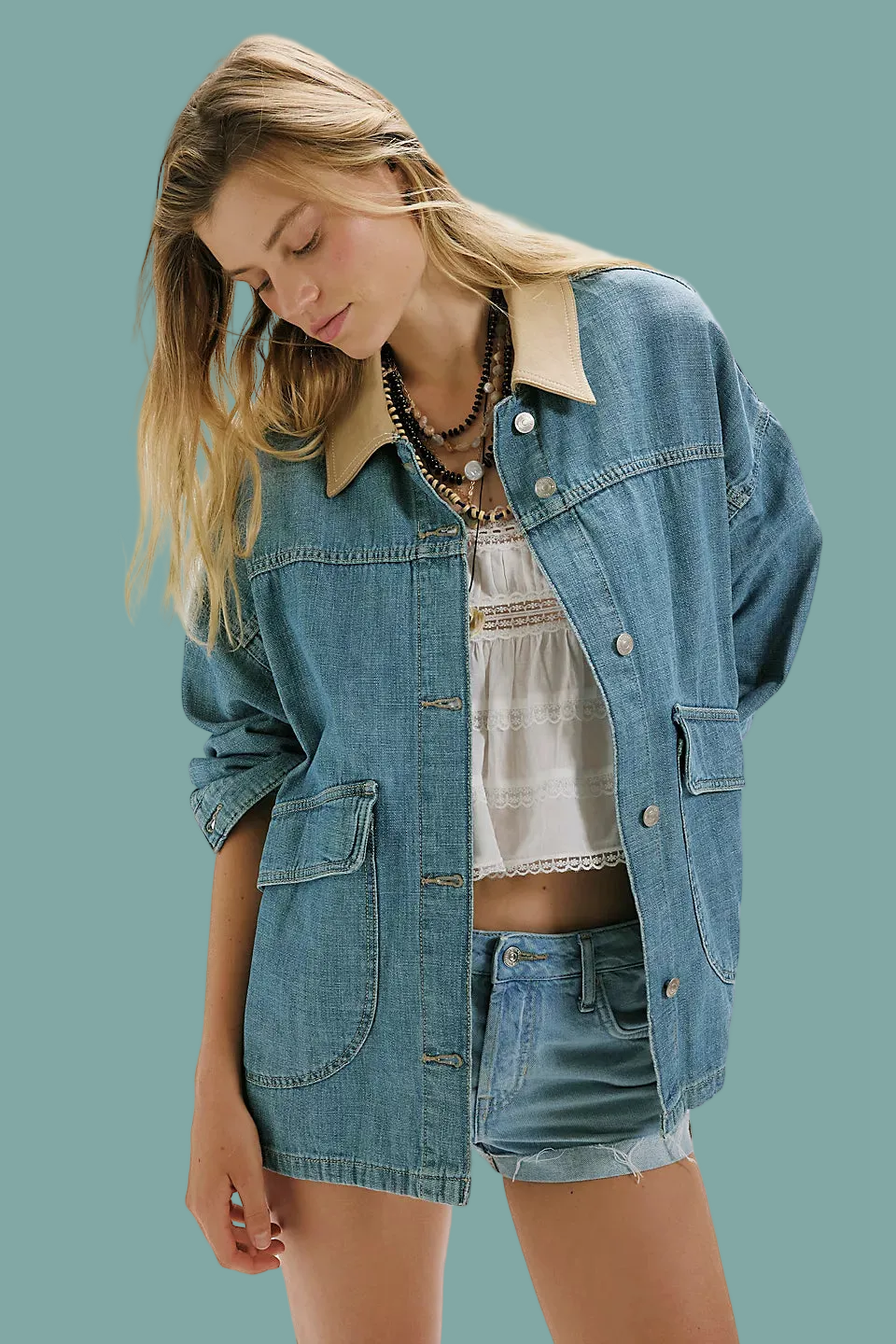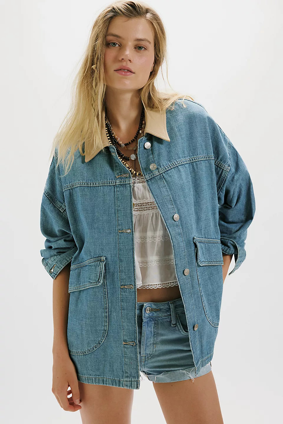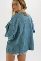 Features: Comfy denim fabrication, contrasting canvas collar, asymmetrical pockets, drop-shoulder sleeve, button-front closure, button-cuffs