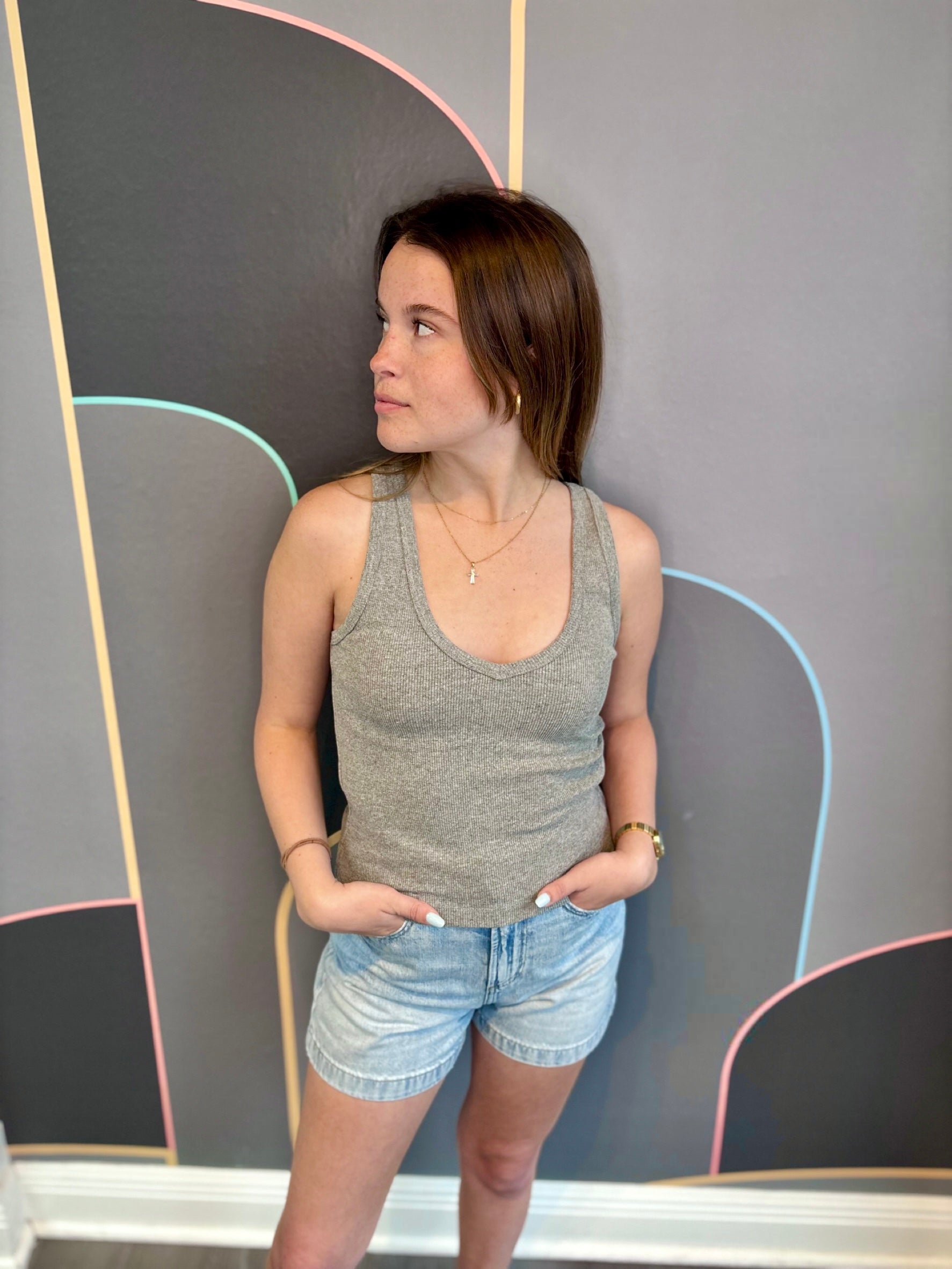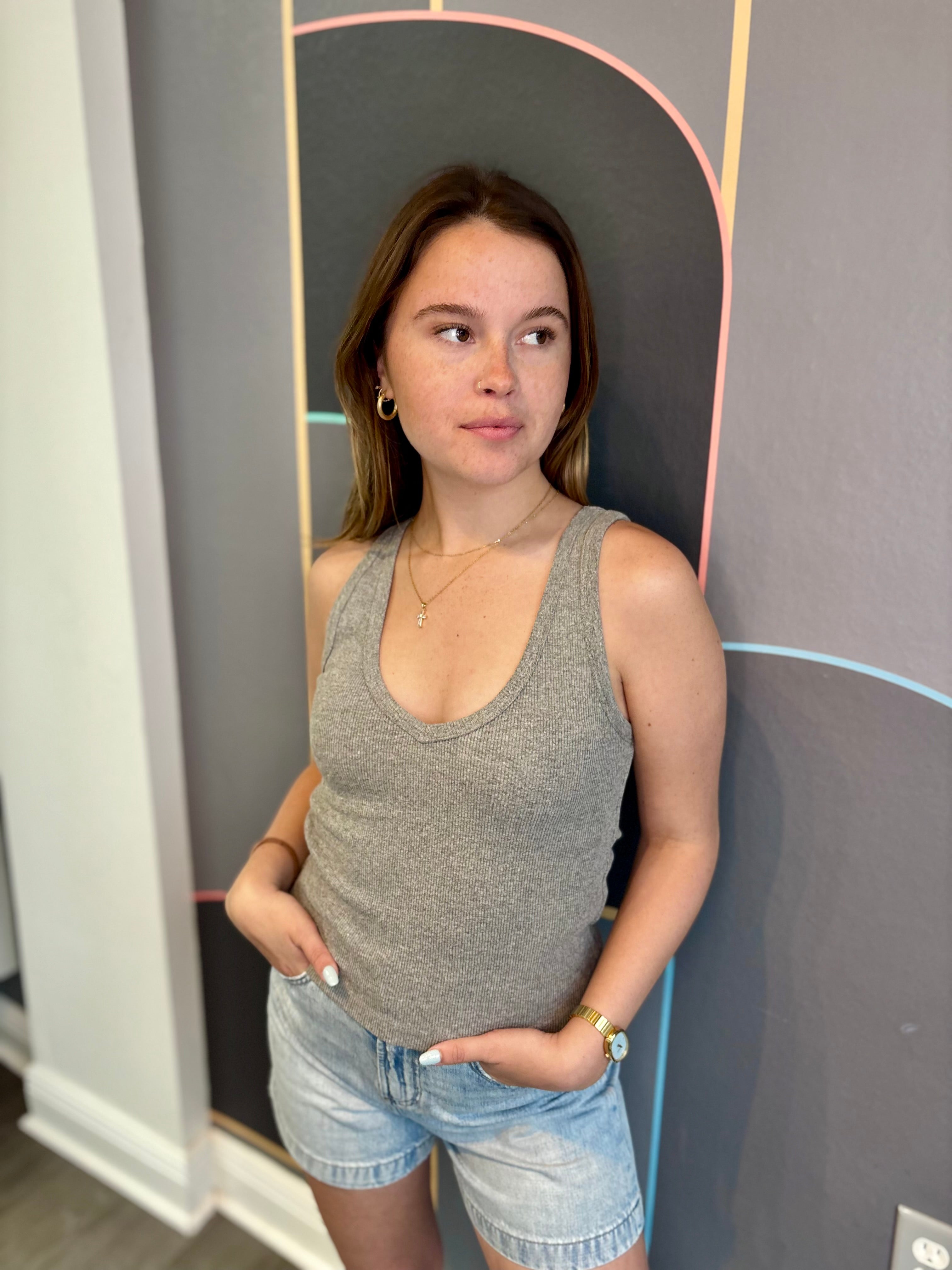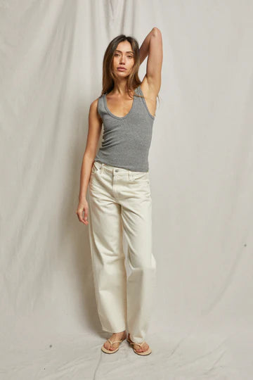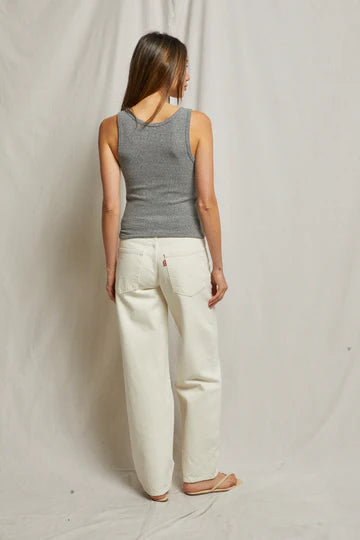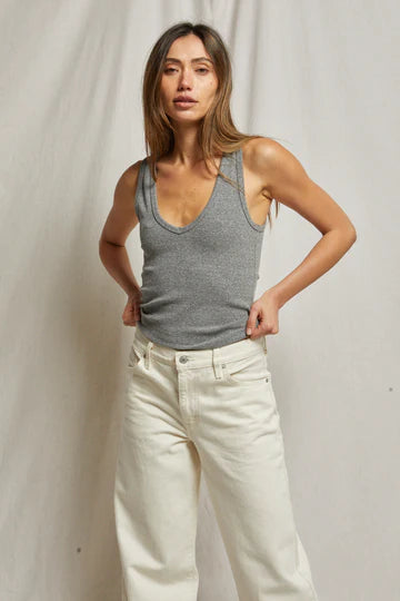 this silhouette shouldn’t be a stranger. routinely paired with classic denim or one of our relaxed french terry bottoms, you will want to add this ribbed tank into your weekly wardrobe rotation.