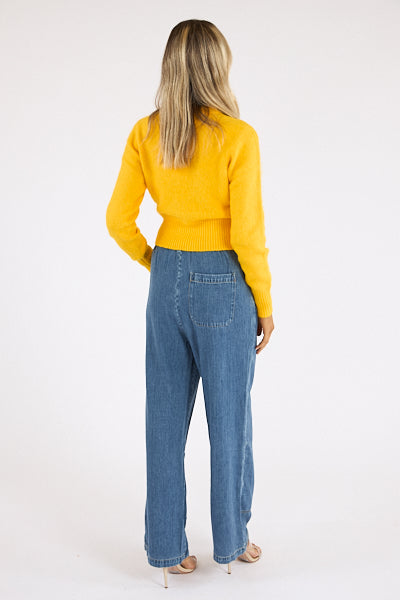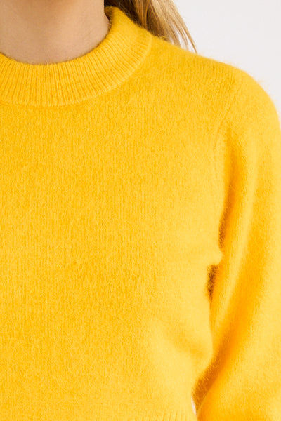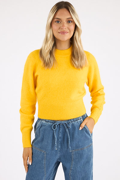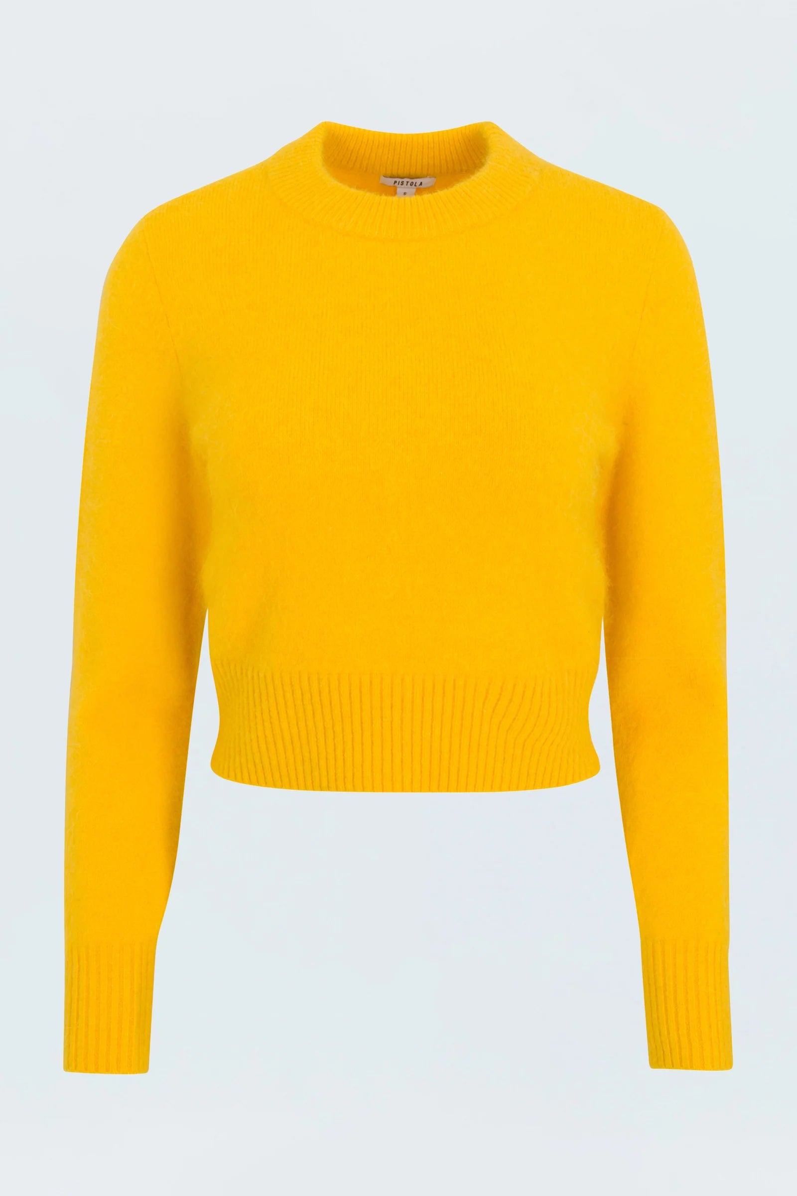 Lightweight wool blend sweater with a soft to the touch hand feel. This long sleeve pullover styling with a shrunken, cropped fit for feminine proportions. Ribbed cuffs, hem, and crew neckline.