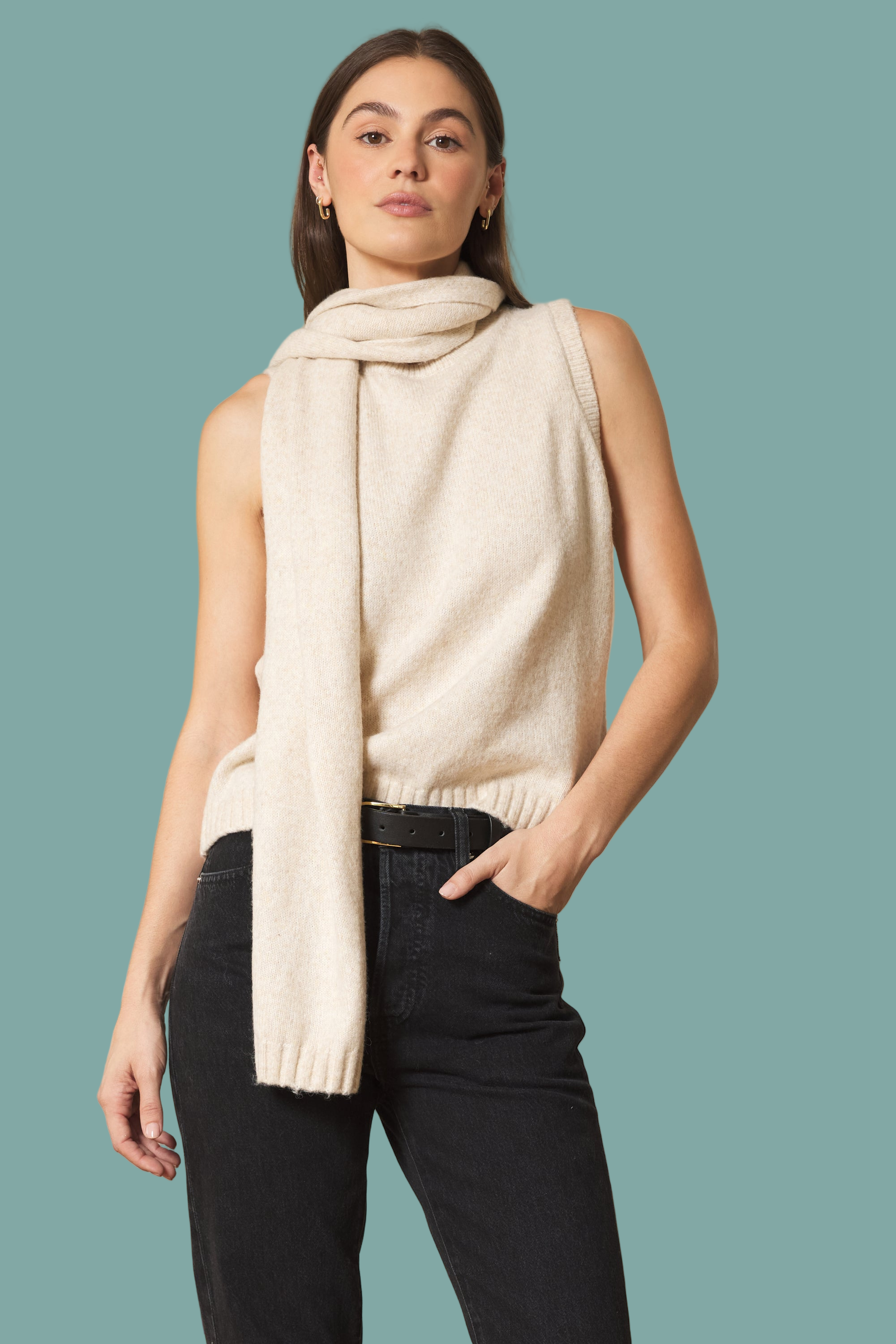 The Silverton Sleeveless Top is a versatile knit piece that works year-round. Crafted in soft oatmeal, this sleeveless design pairs perfectly with the included detachable scarf, giving you two looks in one. Layer it over long sleeves for cooler months or wear it solo when temperatures rise. The neutral tone makes it easy to mix and match with your existing wardrobe, while the quality knit construction ensures lasting comfort and durability.