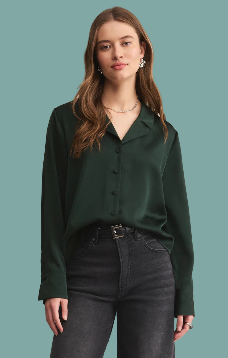 This luxe satin top offers a relaxed fit with a collared neckline and button-front design. Its fluid drape and understated sheen make it a versatile staple for workdays or nights out.