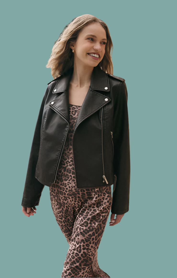 Soft, supple faux leather gives this moto jacket a clean, modern feel, with a zip front and functional zipper pockets. It’s a statement layer you’ll throw on over everything, from floaty dresses to your favorite denim.