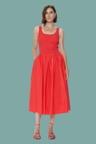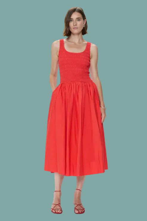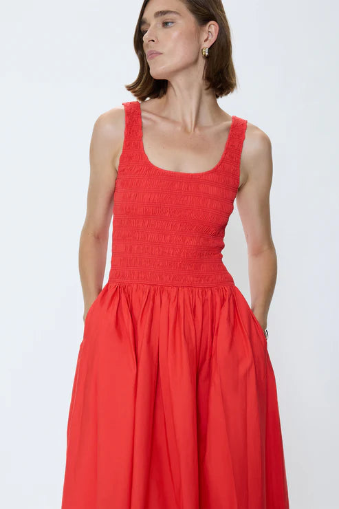 Alessia reimagines the classic drop waist dress with a fitted, smocked bodice and a softly gathered skirt. Graceful and fluid, the lightweight fabric drapes beautifully while holding its shape. In a bright poppy red, Alessia is an elevated everyday style that feels effortless and refined for warm weather—and travel—on the horizon.