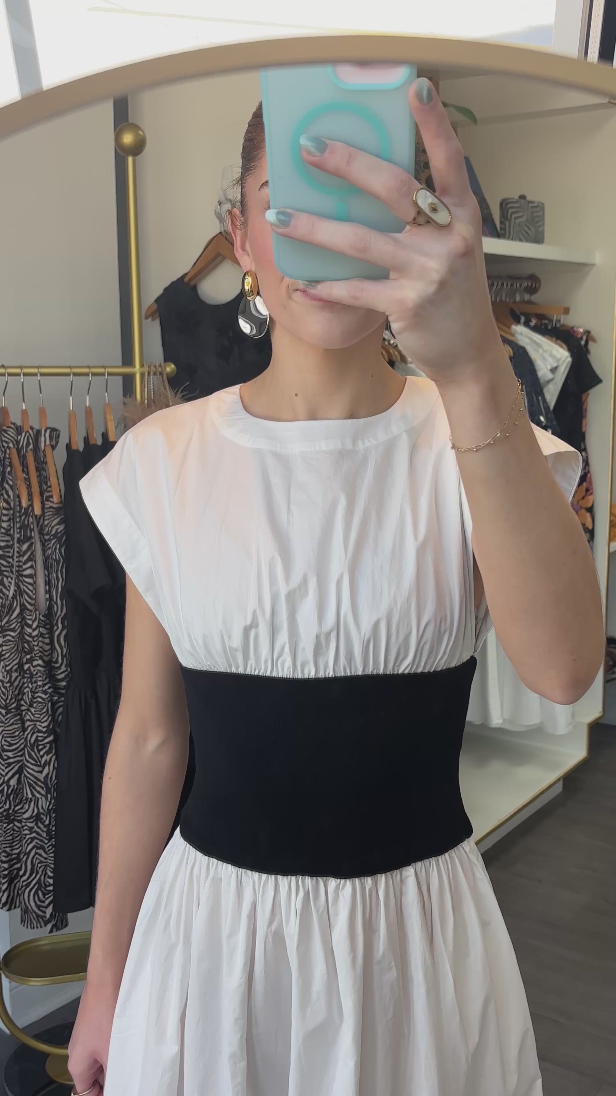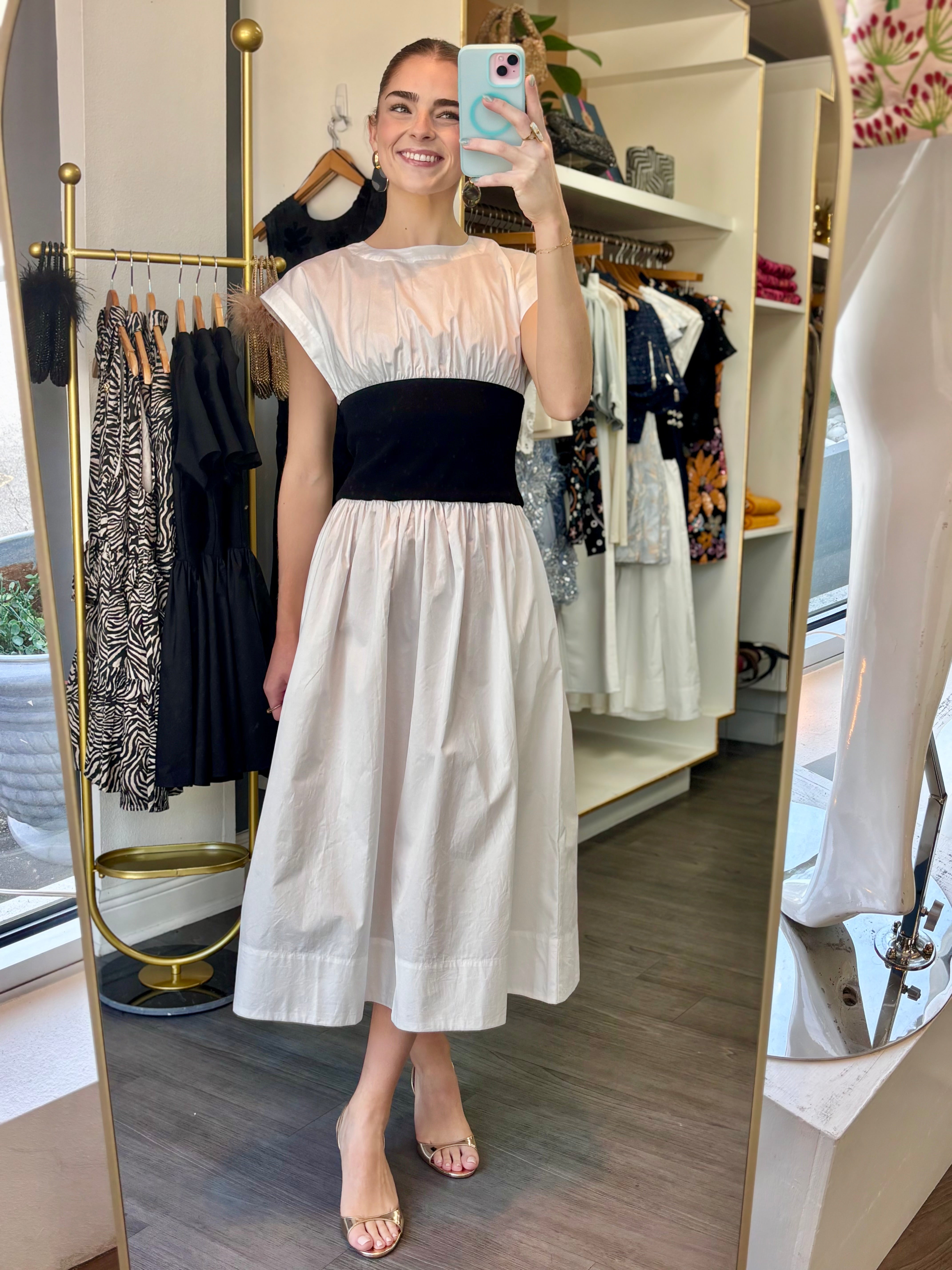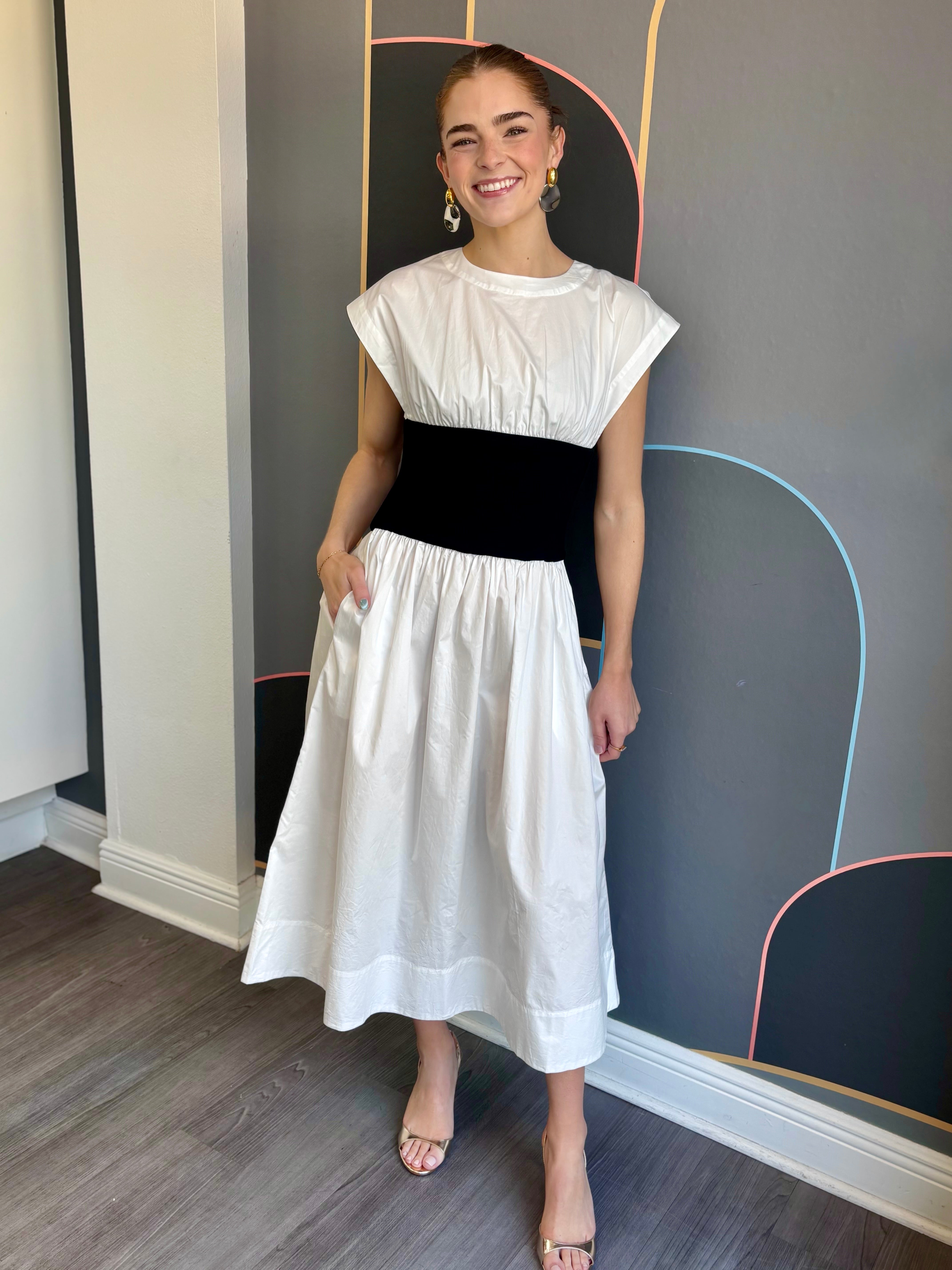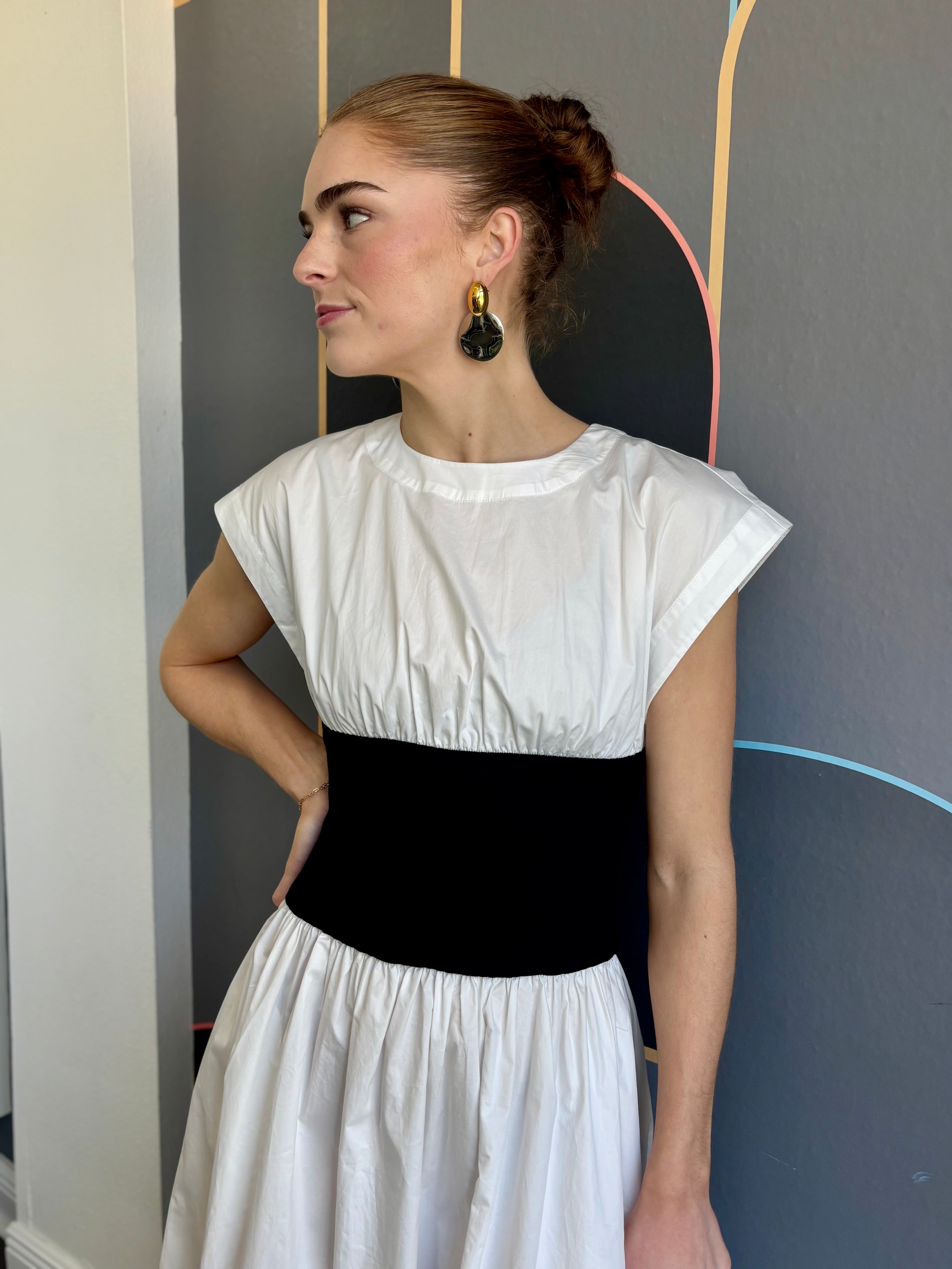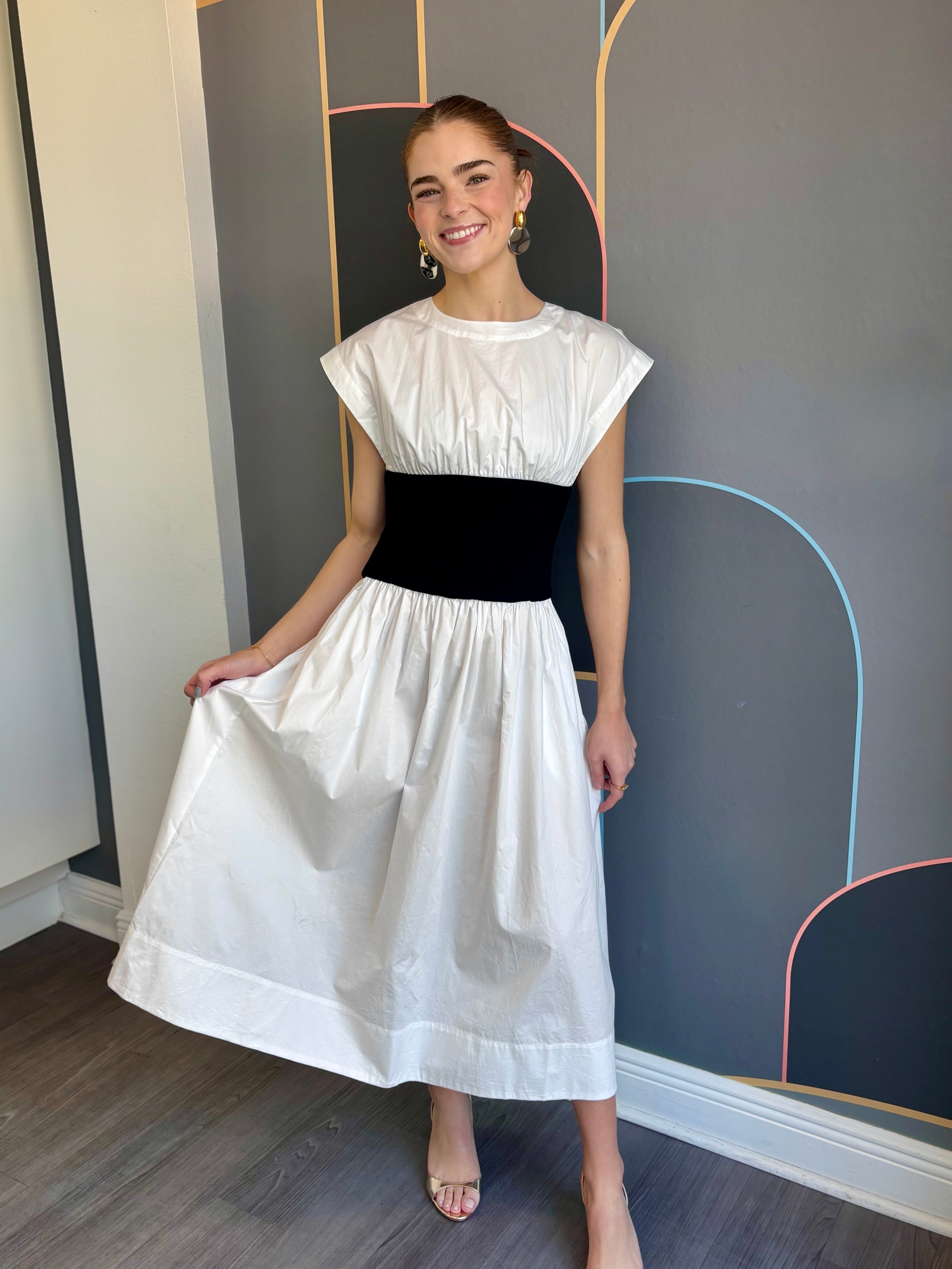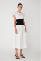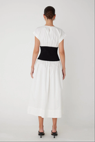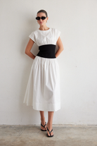 The Alix dress brings together timeless style and smart design. Crafted from crisp white cotton poplin, it offers a clean, polished look that works for countless occasions. The standout feature? A structured black ribbed waistband that adds definition and creates a flattering silhouette. This simple color contrast delivers understated sophistication while giving you that effortless, put-together feel. Whether you're heading to brunch, the office, or an evening out, the Alix is your go-to piece for looking refined without trying too hard.
