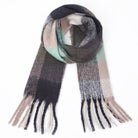 Wrap yourself in cozy texture with this chunky plaid mohair-look scarf. Featuring a bold multicolored plaid pattern and soft, fuzzy finish, it's the perfect layering piece for fall and winter. The playful fringe trim adds movement and charm to any outfit. Lightweight yet warm, this scarf drapes beautifully over jackets, sweaters, or dresses for instant style and comfort.