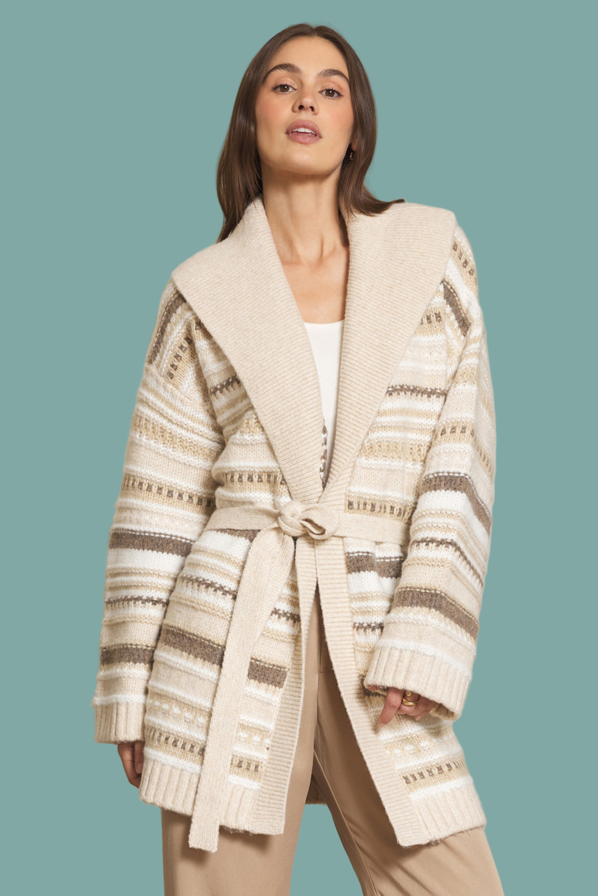 The Everett Wrap Cardigan brings effortless style to your everyday rotation. This striped woven piece features an open front design with a classic knit collar, perfect for layering over tees or dresses. The attached belt cinches at the waist for a flattering silhouette that transitions seamlessly from casual outings to relaxed work days. Lightweight and versatile, it's the go-to layer you'll reach for season after season.