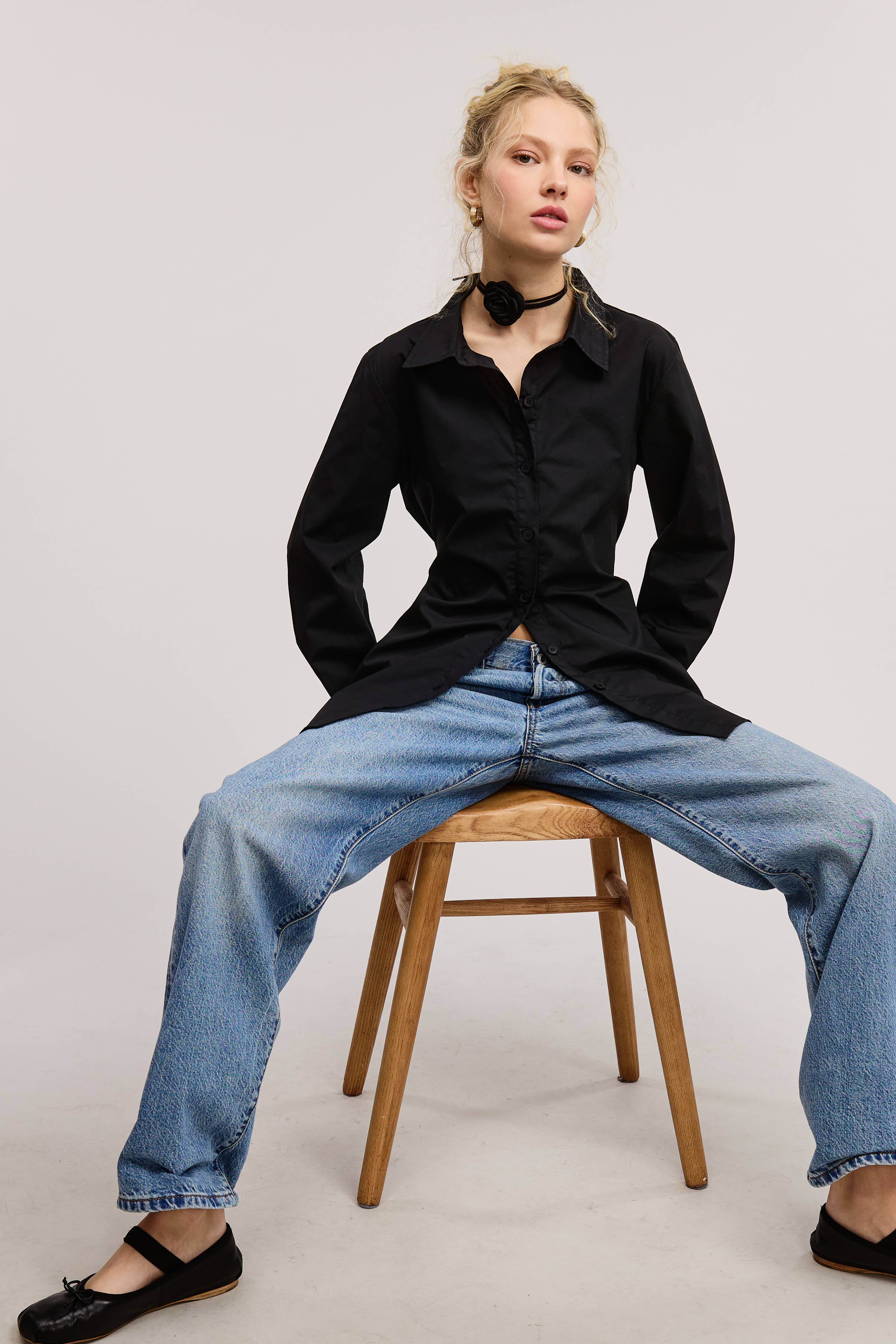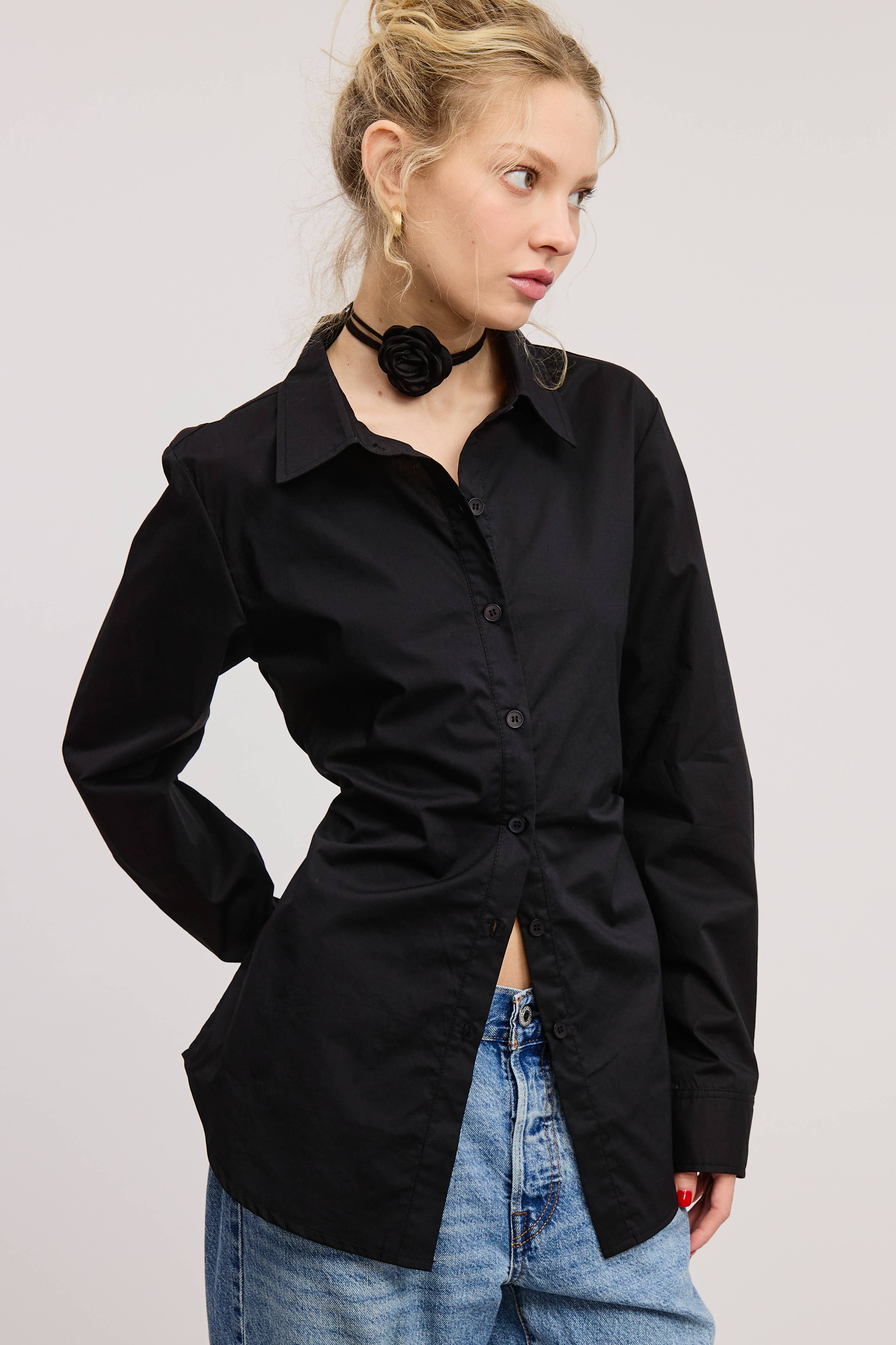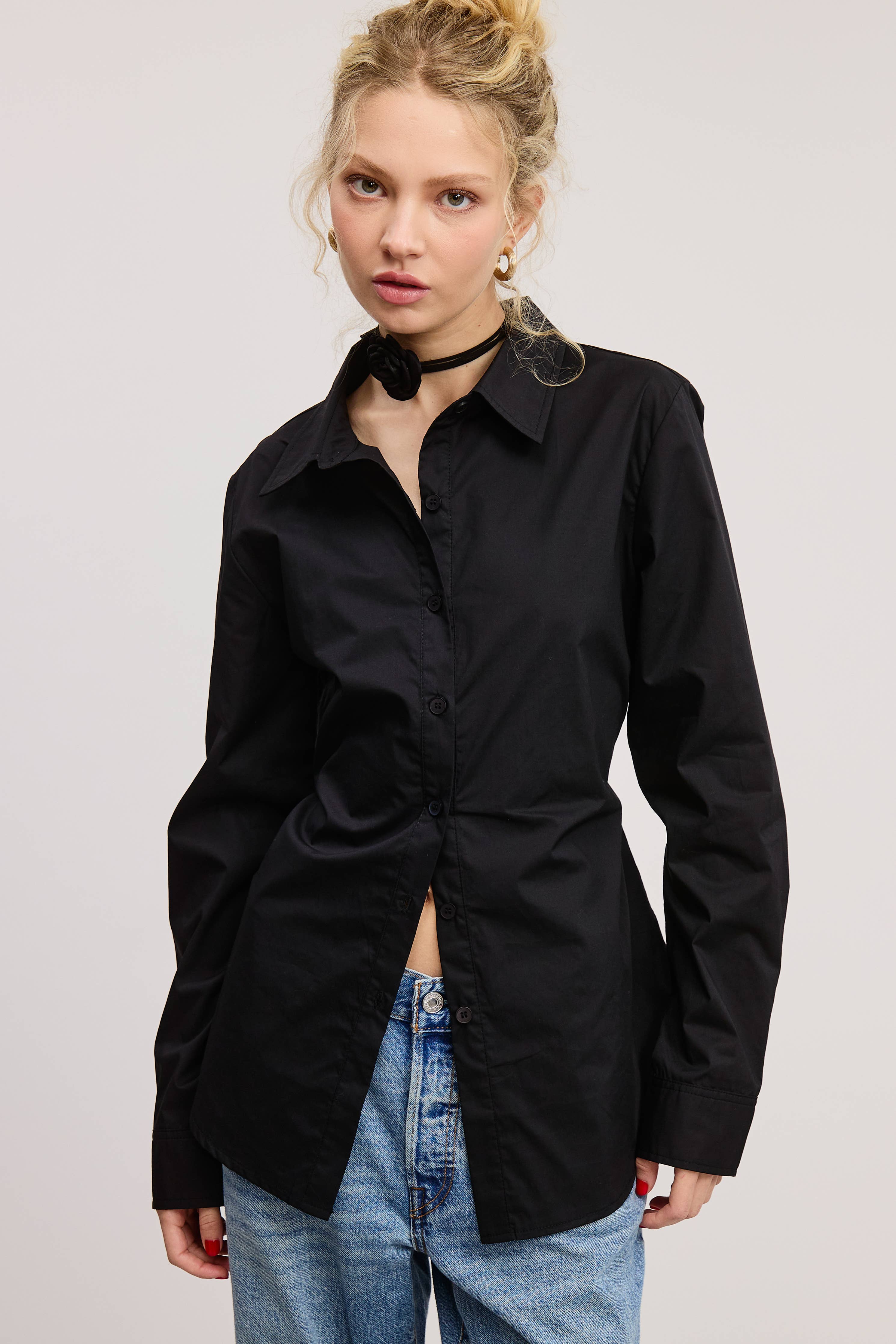 This long-sleeve collared blouse offers a fitted shape with a front button-down design and a unique self-tie ribbon at the back, adding a stylish touch and extra shape.