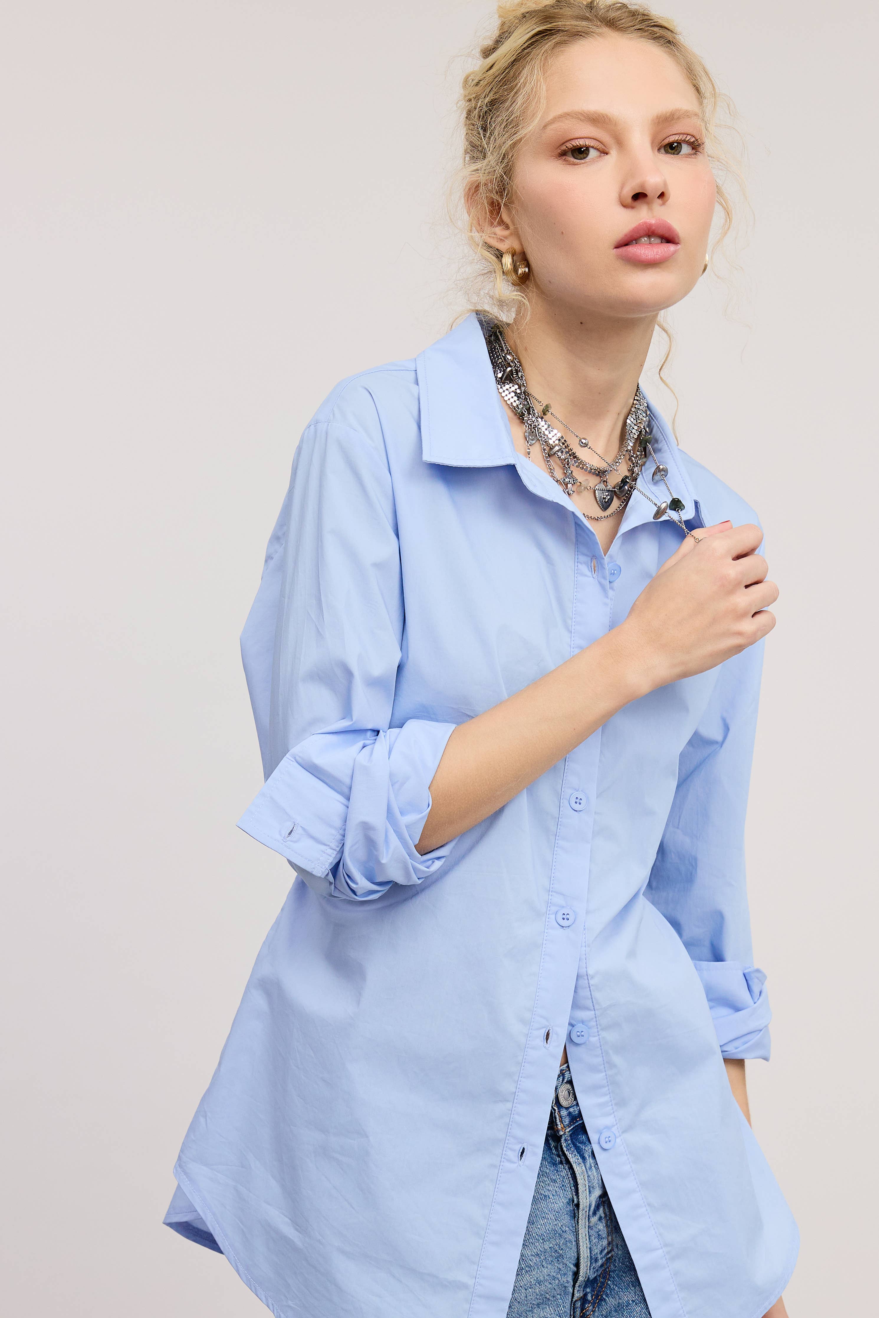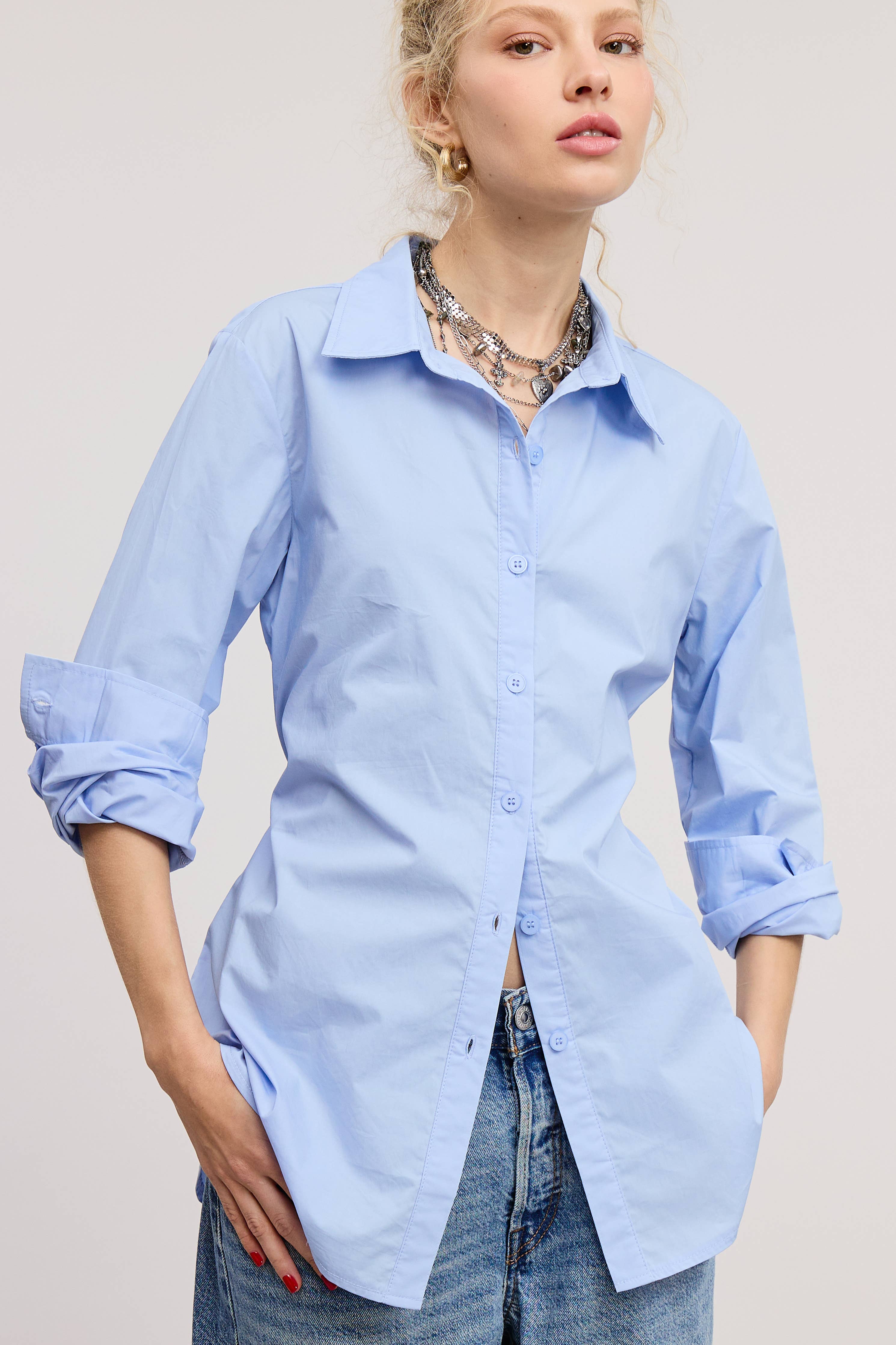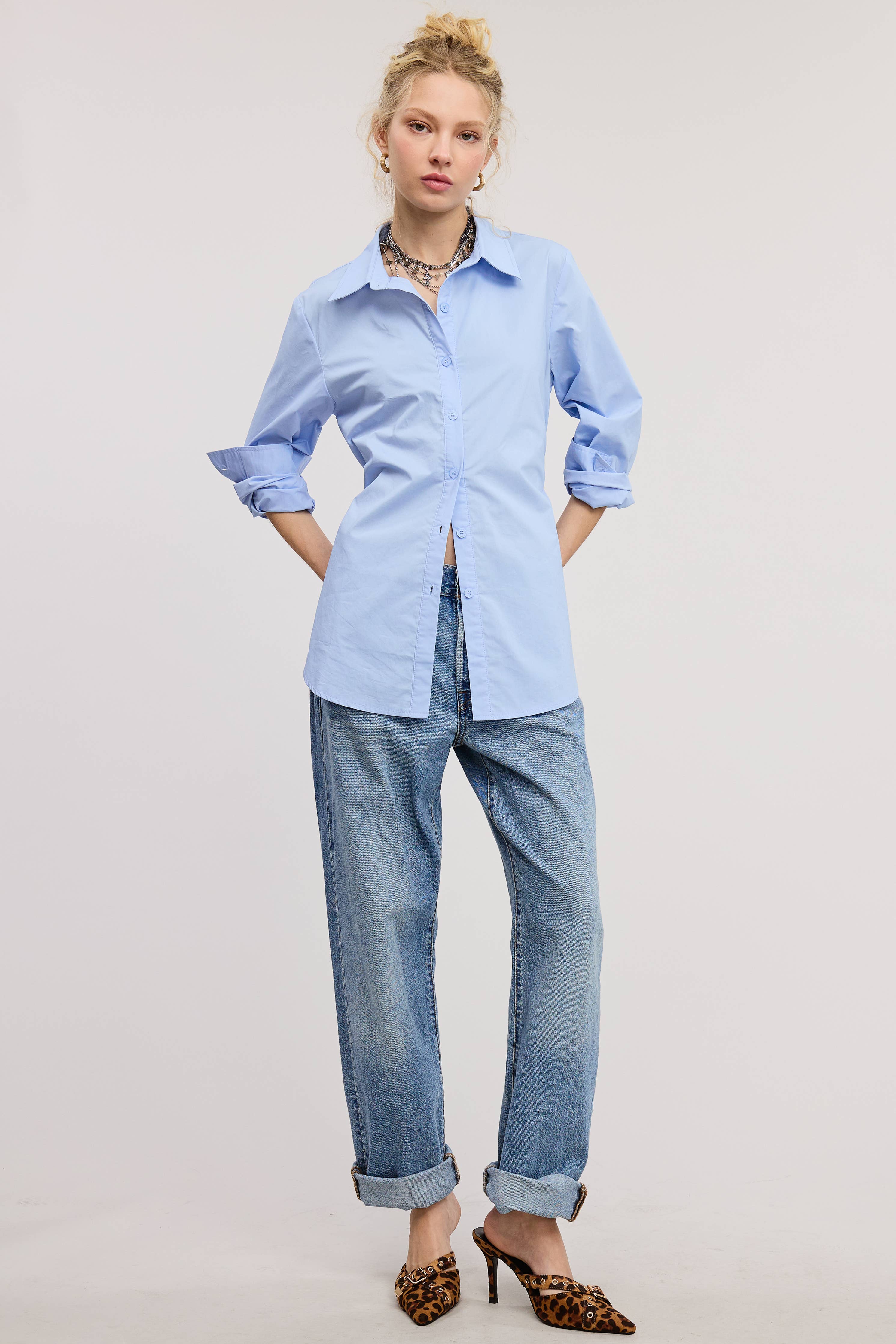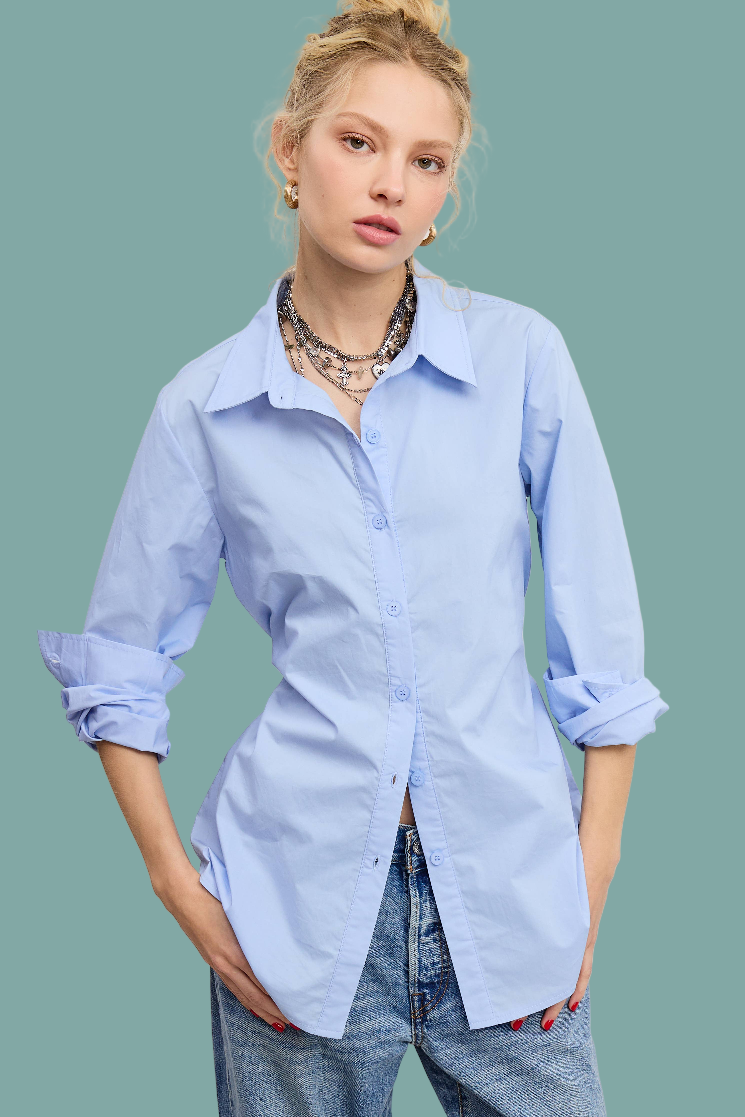 This long-sleeve collared blouse offers a fitted shape with a front button-down design and a unique self-tie ribbon at the back, adding a stylish touch and extra shape.