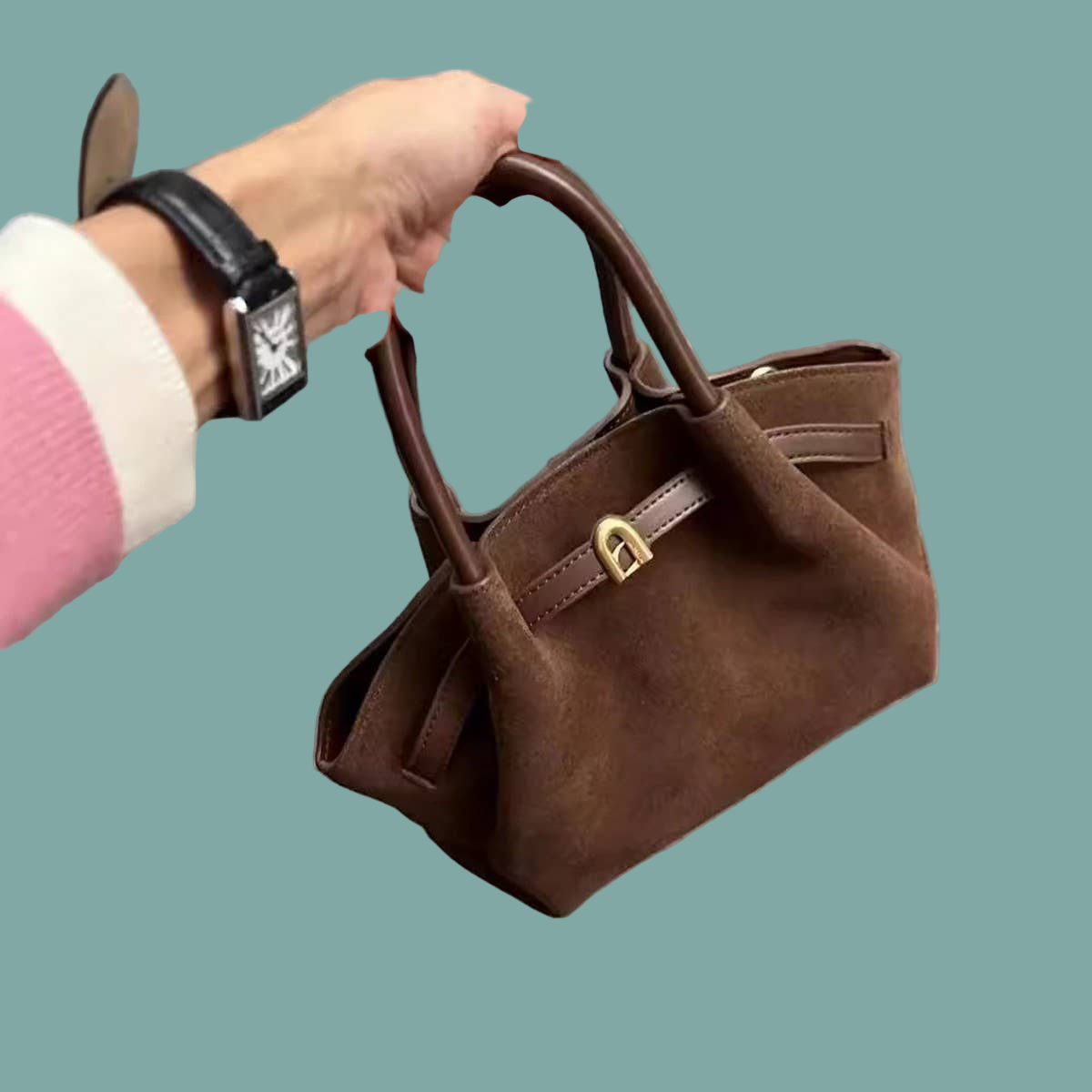 The Blair Suede Mini Handbag is your go-to accessory for effortless style. Crafted from soft brown suede, this compact bag features a comfortable shoulder strap for hands-free carrying and an elegant gold embellishment that add a touch of sophistication. Perfect for everyday outings, nights out, or whenever you need to keep your essentials close without the bulk. A versatile piece that transitions seamlessly from day to night.