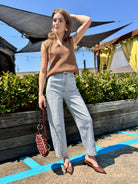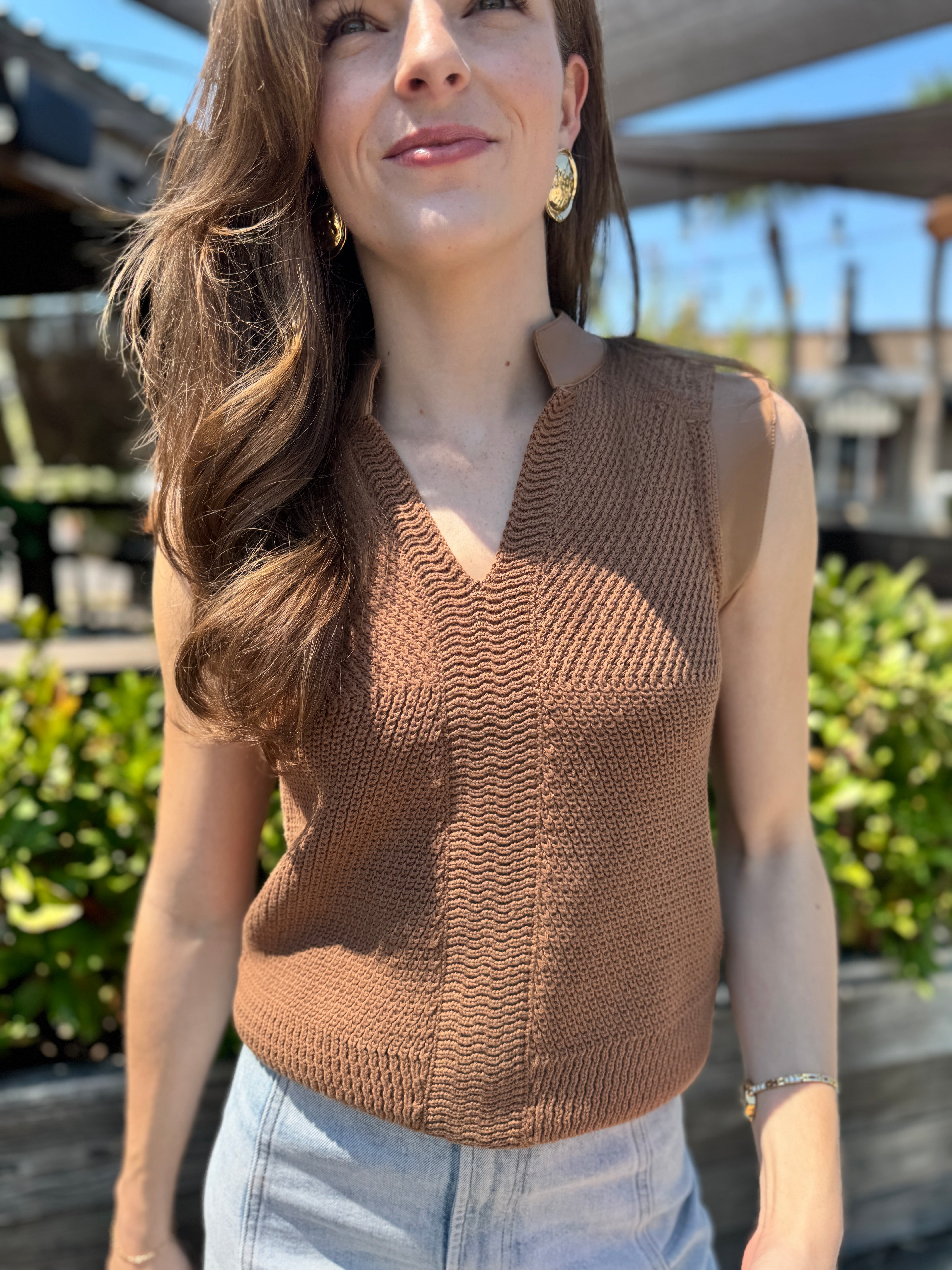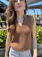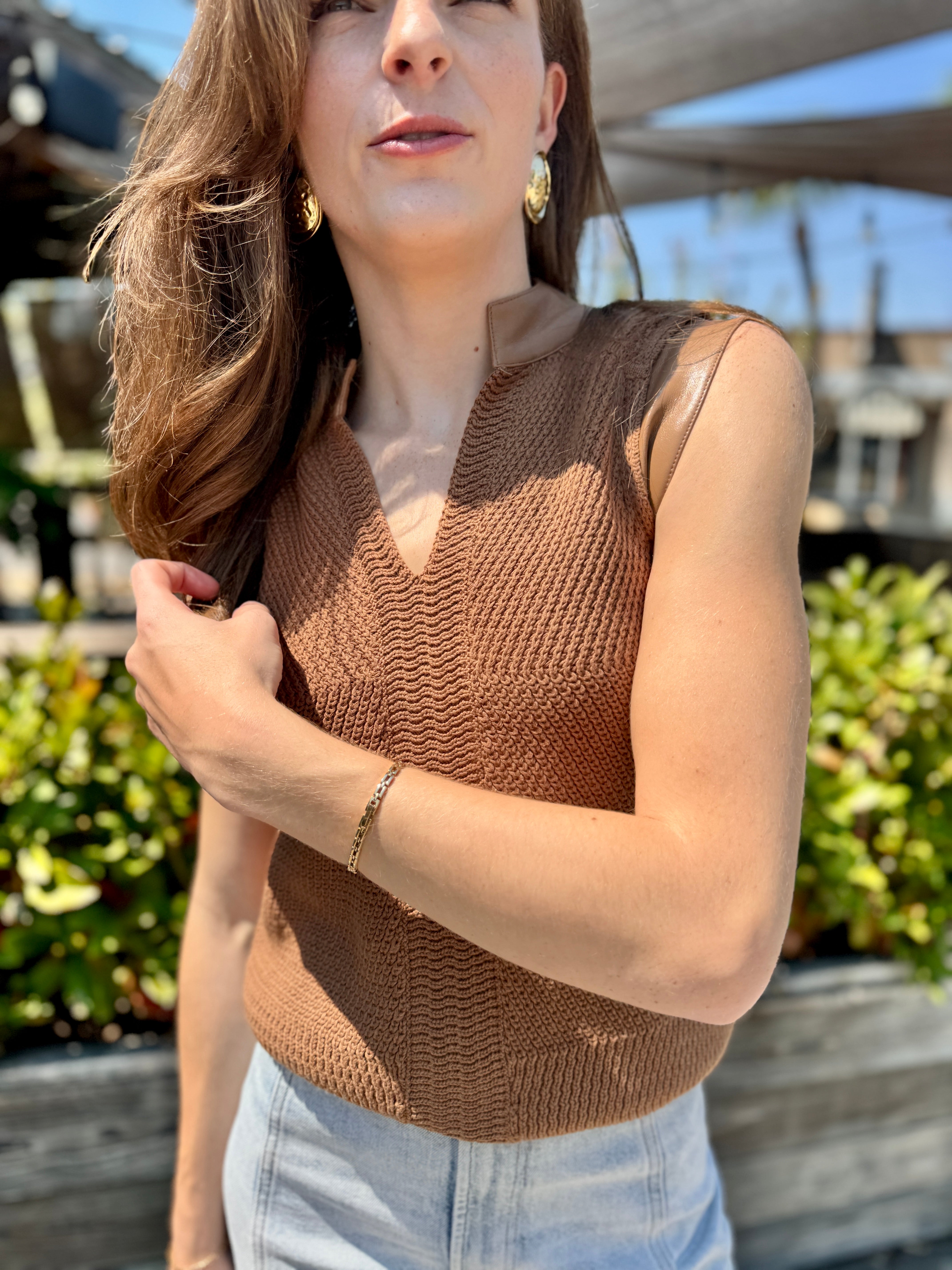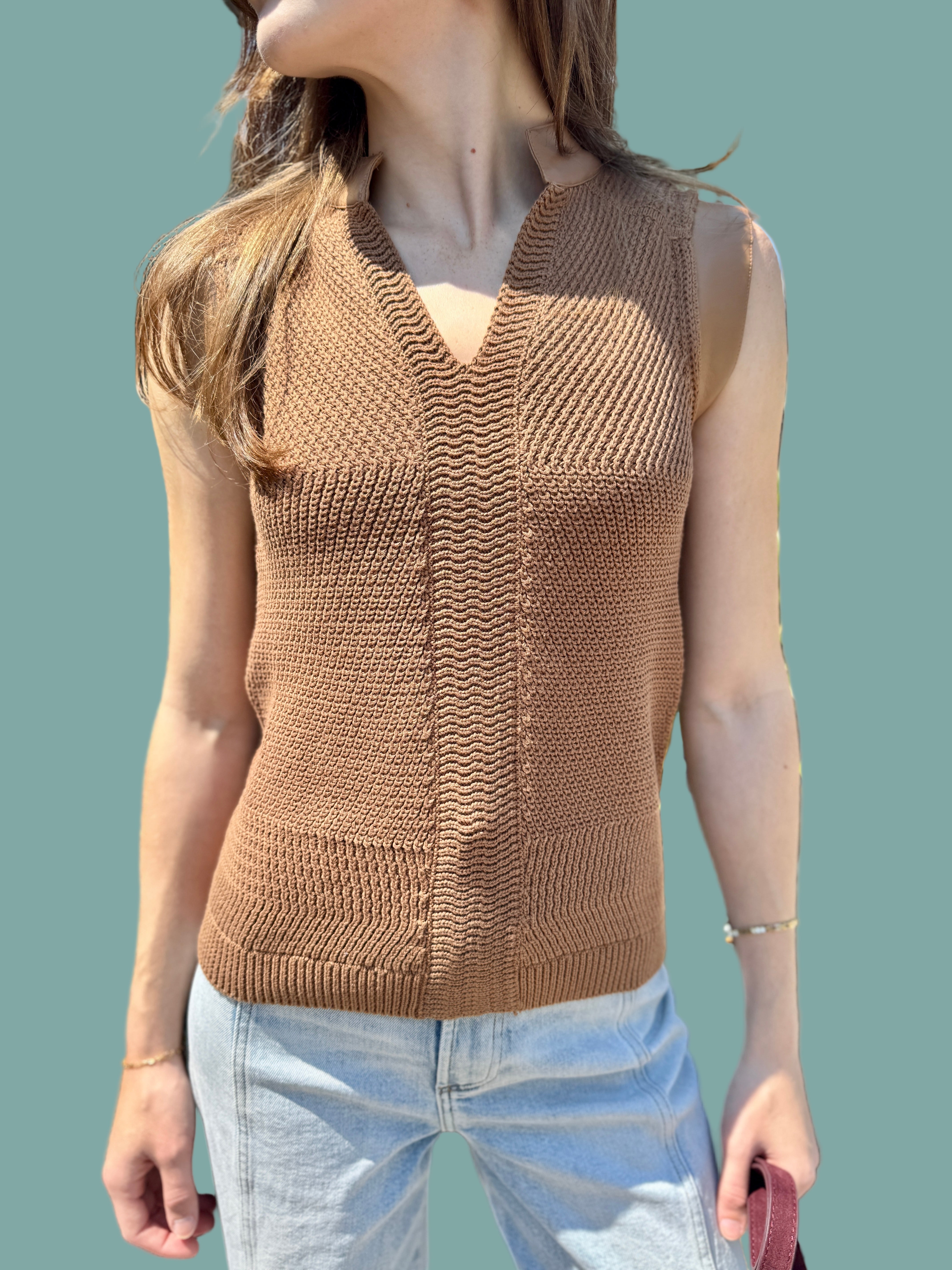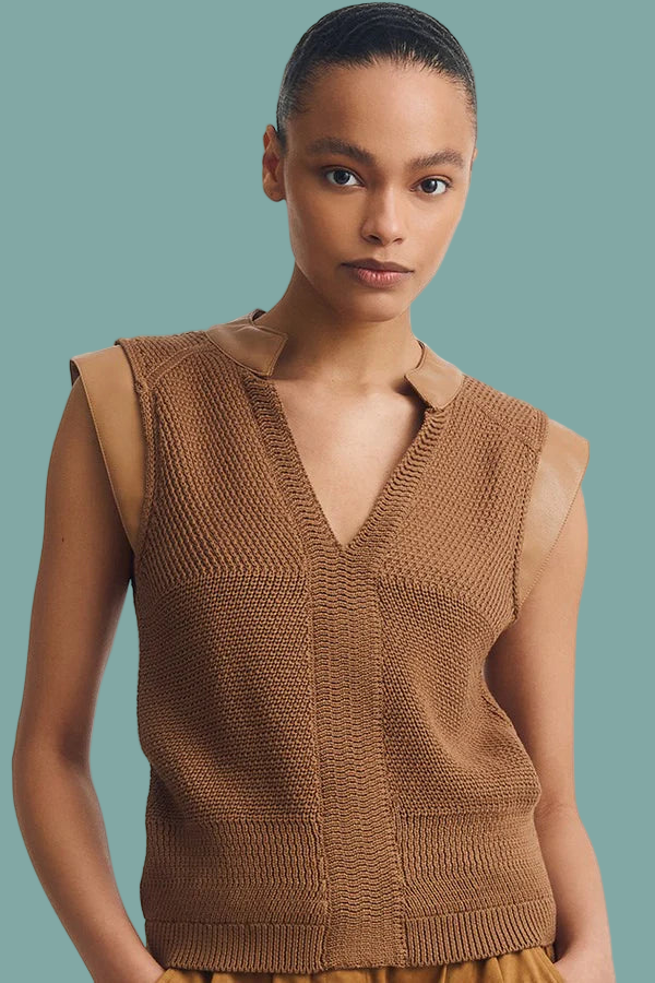 The Juno Top is a sleeveless sweater crafted from 100% cotton yarn for a soft, breathable feel. It features stylish vegan leather trimming that adds an edgy touch while keeping it cruelty-free. Perfect for casual days, this mixed-media piece combines comfort and modern style effortlessly.
