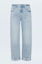 The Kacey Mid Rise Cuffed Boyfriend jeans are your new go-to for effortless style and comfort. This easy fit provides a relaxed yet flattering silhouette, perfect for any occasion. The light denim wash and cuffed hem offer a versatile look that can be dressed up or down, while the seaming detail creates a subtly elongated figure. Made from lightweight rigid denim, the Kacey jeans are going to be a staple piece in your closet.
