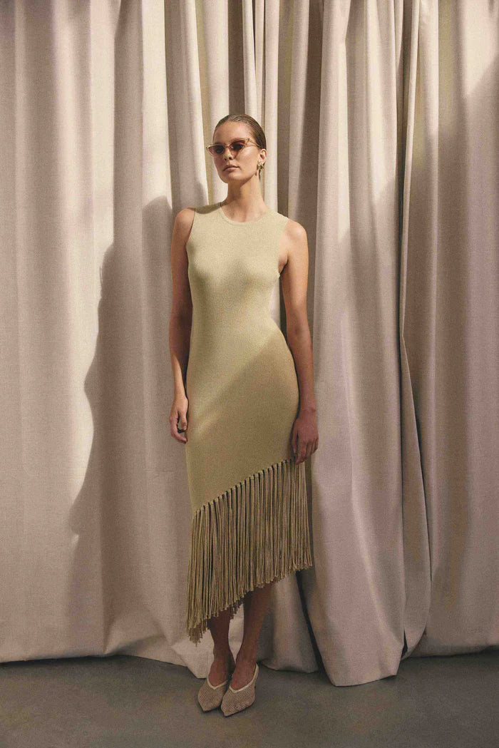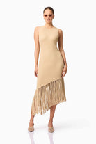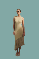 Adding a playful yet sophisticated finish, the fringe detailing at the hem moves gracefully with every step, creating an eye-catching sense of movement. Style the CURAAAE Selah Asymmetrical Midi Dress with strappy heels and a statement clutch for a bold, confident ensemble that feels both modern and timeless.
