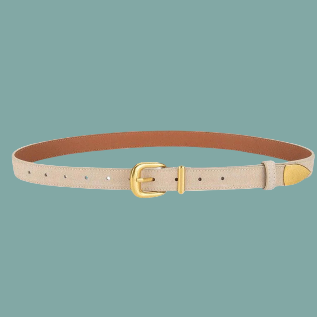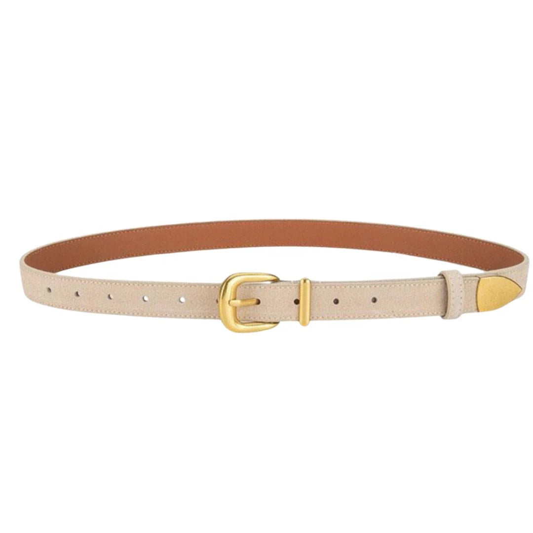 Elevate your everyday look with this sleek sueded belt. Crafted from soft micro suede vegan leather, it features a polished gold-plated brass buckle and tip for a touch of sophistication. The adjustable design fits waists from 30" to 38", making it versatile for any occasion. At 7/8" wide and 43" long, it's the perfect width for both casual and dressed-up outfits.