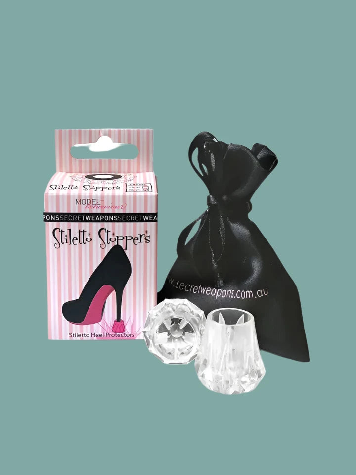 Our exclusive High Heel Protectors prevent high heel stiletto shoes from sinking in the grass! High Heel Stoppers in clear are the perfect solution for the races, garden parties or weddings to avoid that sinking in the grass feeling. Walk tall and avoid the embarrassment of getting your stilettos stuck in the turf with Secret Weapons diamond faceted high heel protectors.