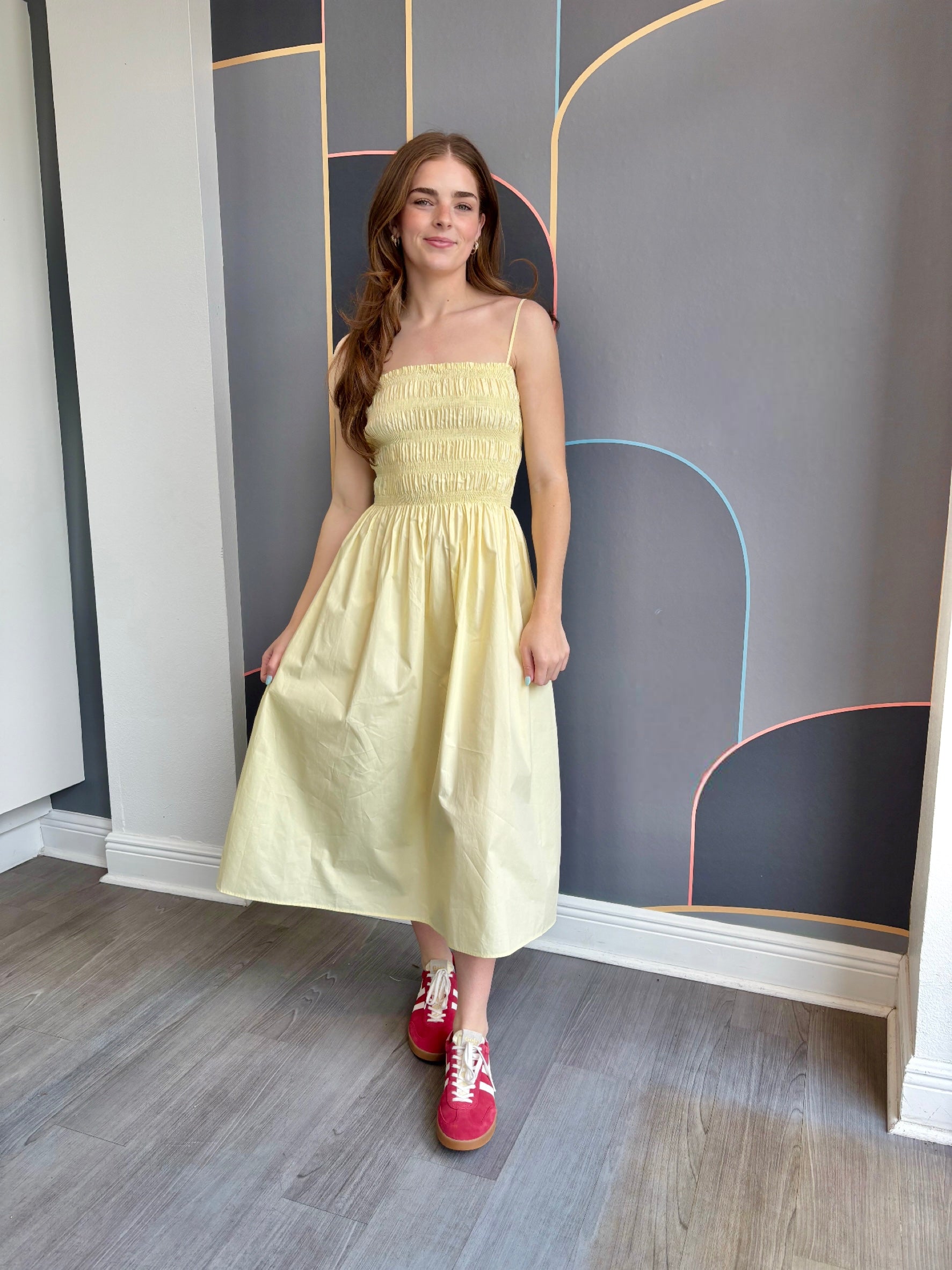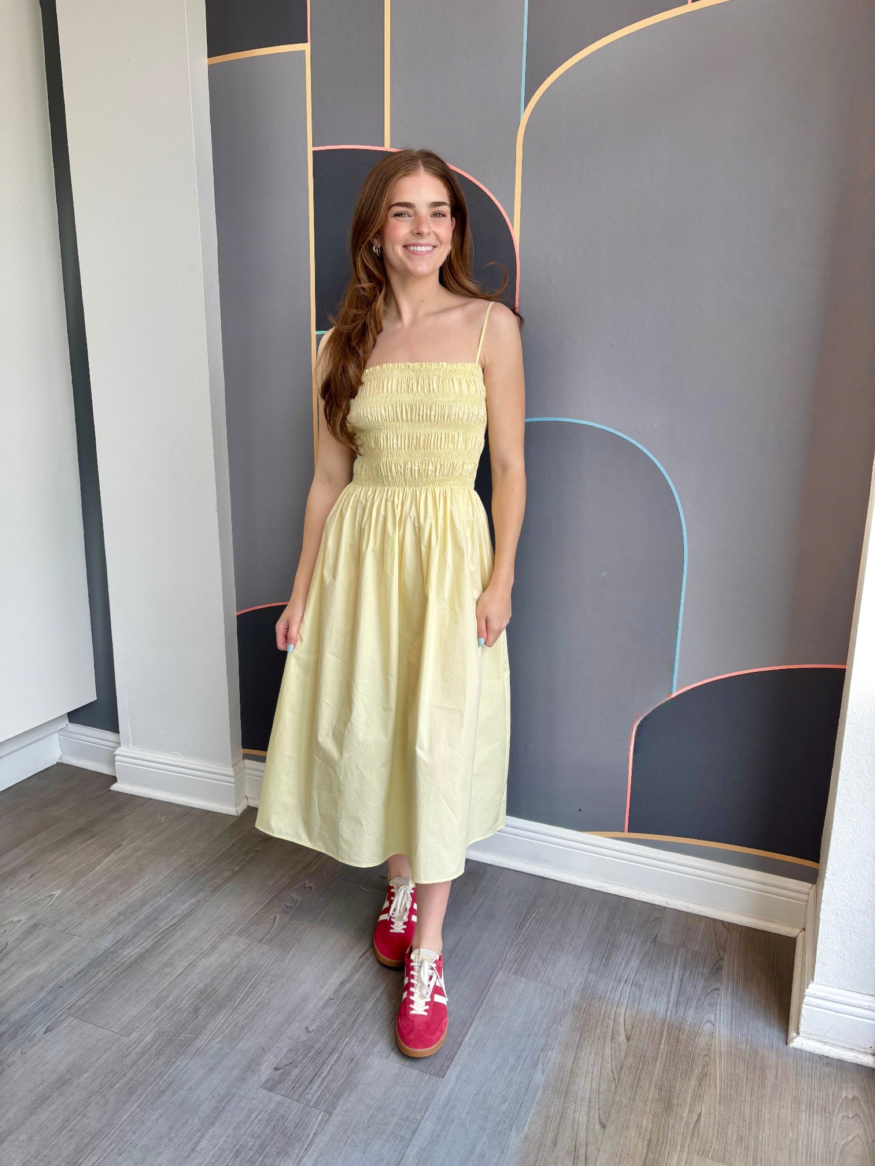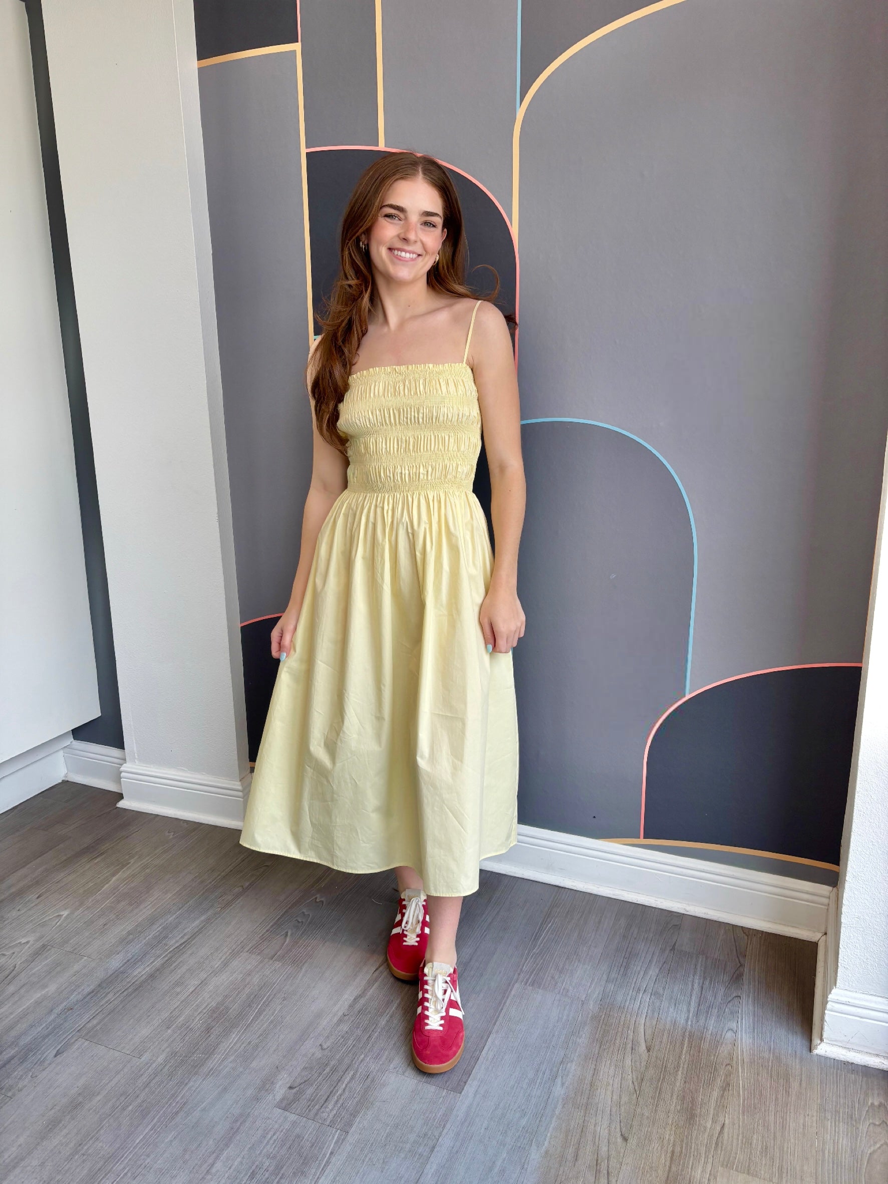 The Vivian Smocked Dress is the perfect blend of style and comfort! This adjustable spaghetti strap sundress features a beautiful butter yellow color and a smocked design for the perfect fit. Ideal for any summertime occasion, this dress will have you looking and feeling effortlessly chic.